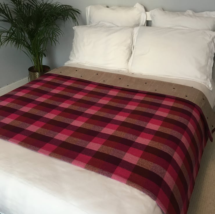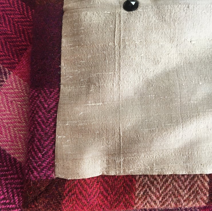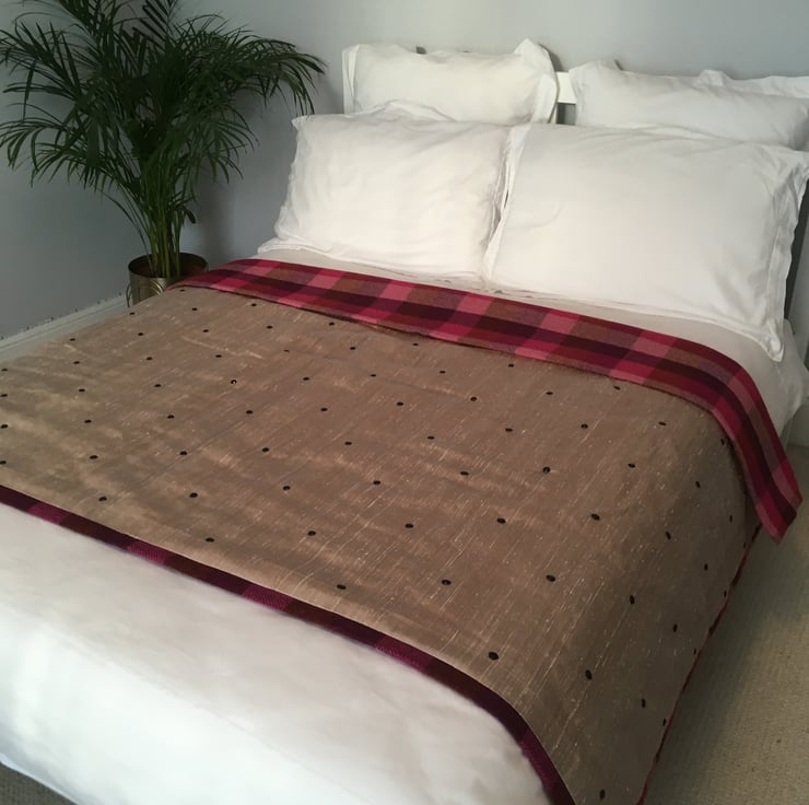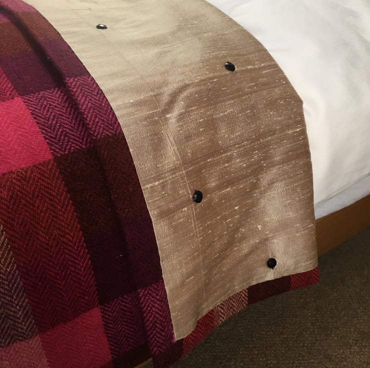 Striking and unique, this reversible quilt is individually crafted and entirely hand stitched using specialist techniques. Combining Harris tweed and silk, this piece offers a dual decor for adding luxury to a bed, sofa, special snug or even your camper van. The multi properties of wool and silk provide both warmth and coolness when needed. Entirely practical, with a light polyester wadding, it can be used year-round as that extra layer but with that special something that shimmers.