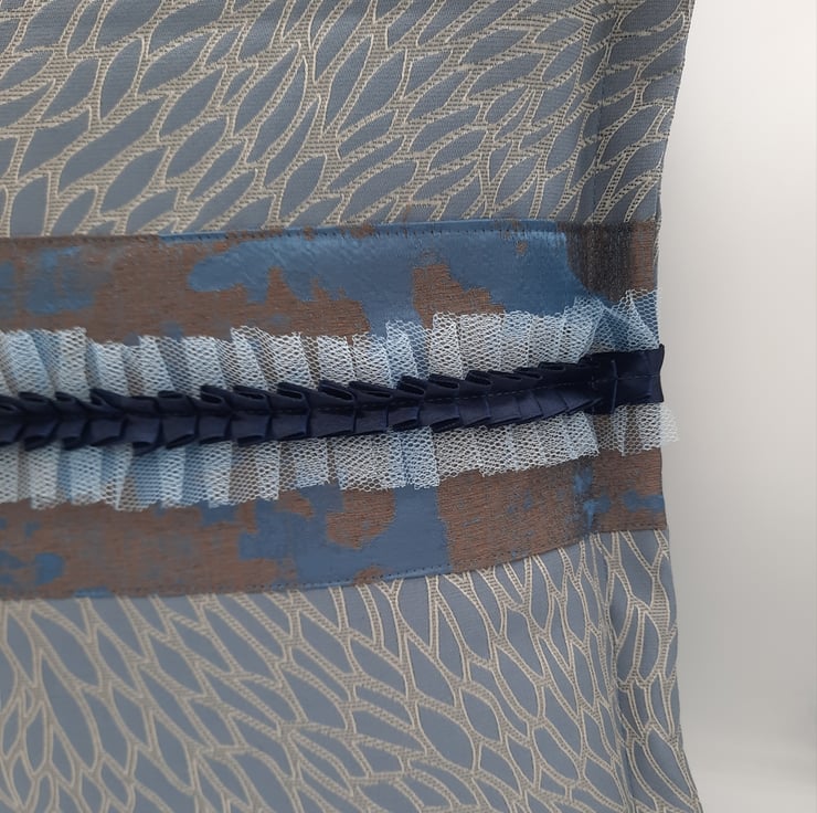 Blue and copper colour fabric middle band topped with blue tulle and navy ribbon pleats.
