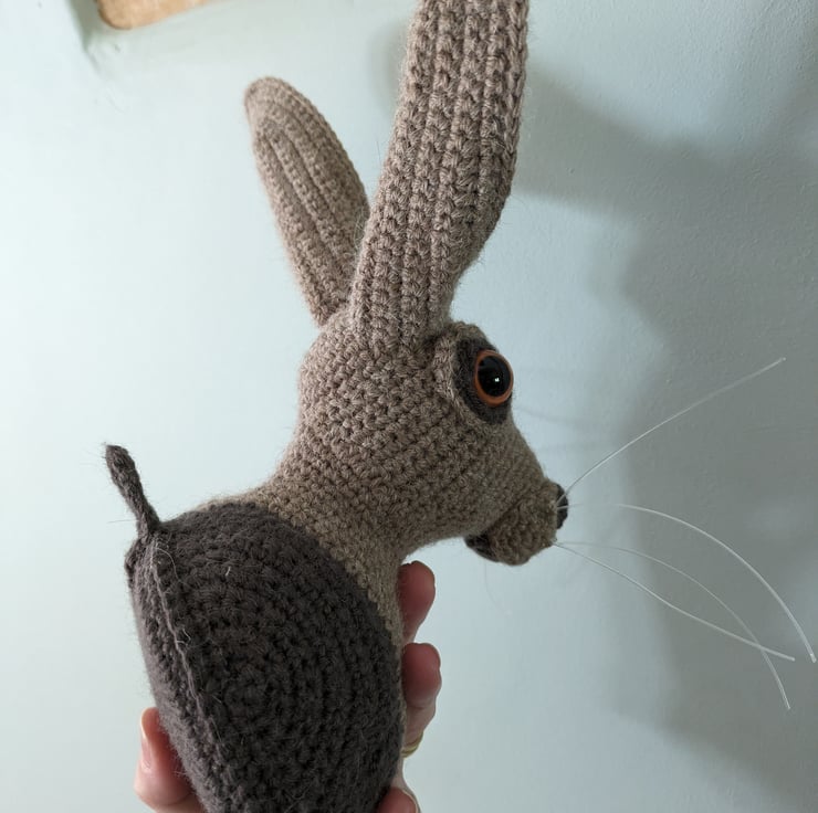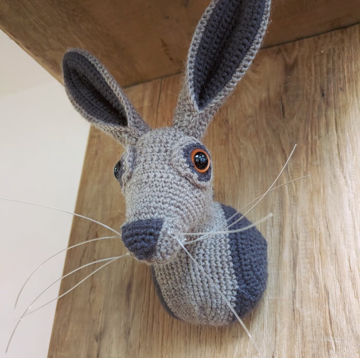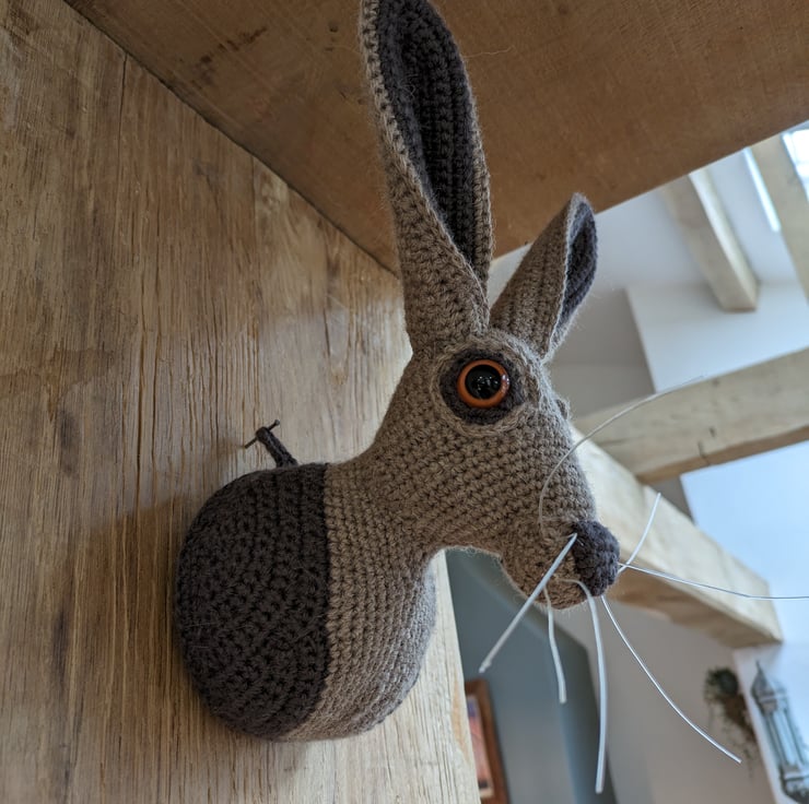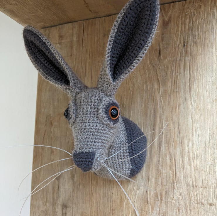 Beautiful hare head designed by Vanessa Mooncie trophy heads to collect edition. And adapted. Made using Drops Lima wool and alpaca mix yarn, and safety eyes. Measures approx 27cm to top of ears and 19cm are widest part of ears spread out. Whiskers are a nylon thread. He's a beauty!