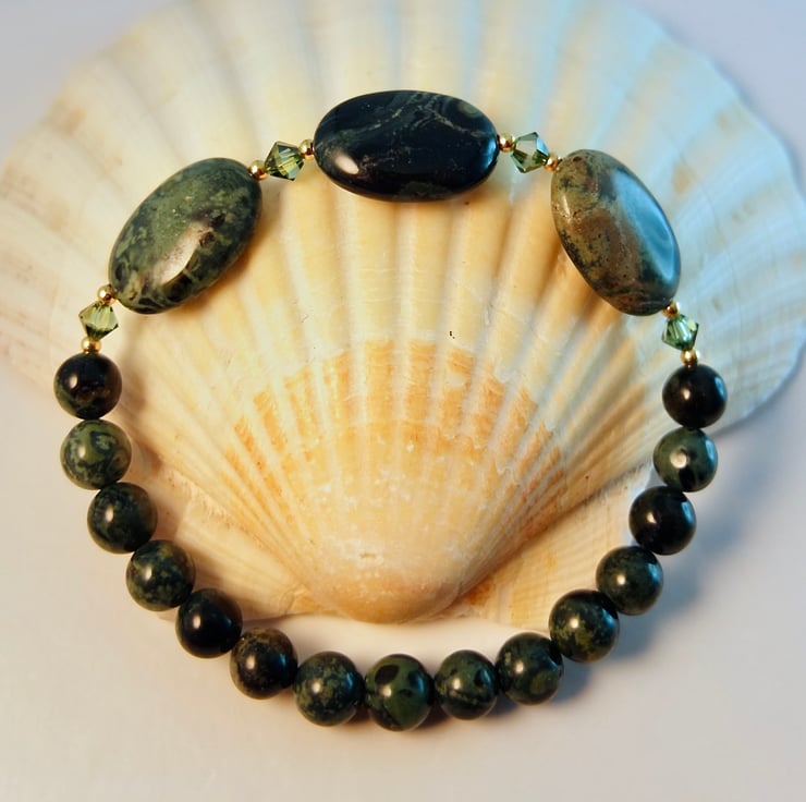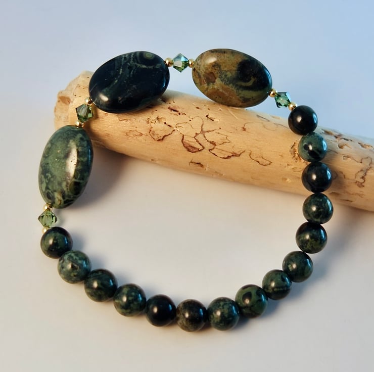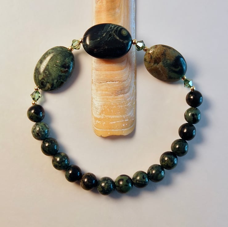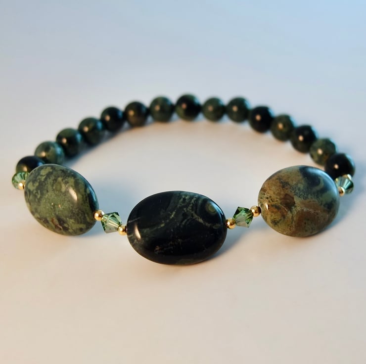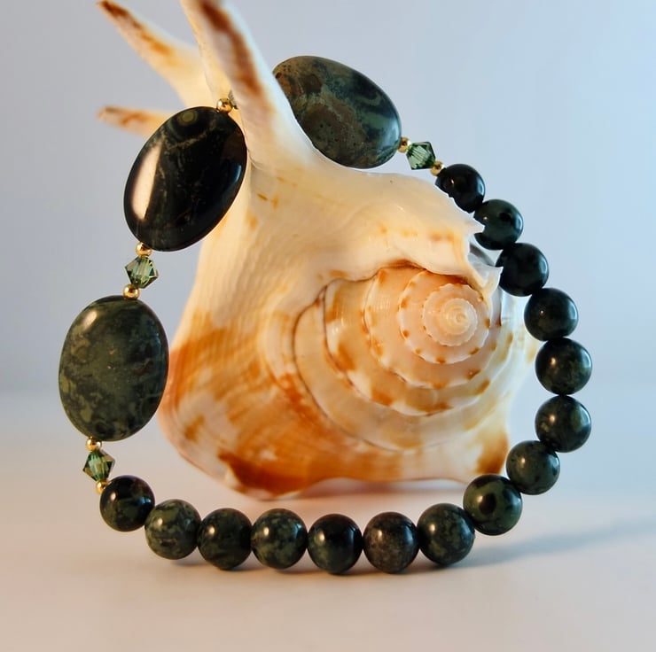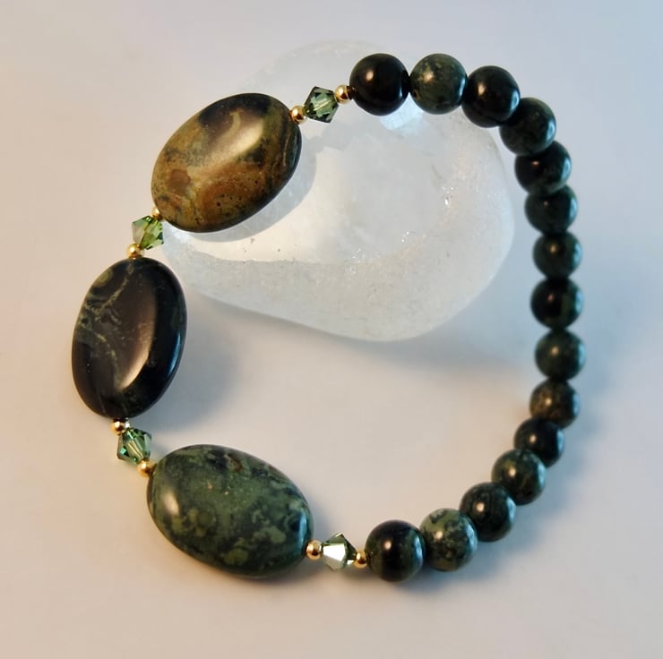 This stretch bracelet is made using a trio of 13x18mm oval Kambaba Jasper beads, a unique green and black stone of volcanic origin with fascinating swirling patterns, with 6mm Kambaba Jasper rounds making up the circle.