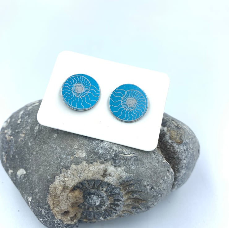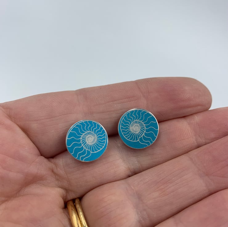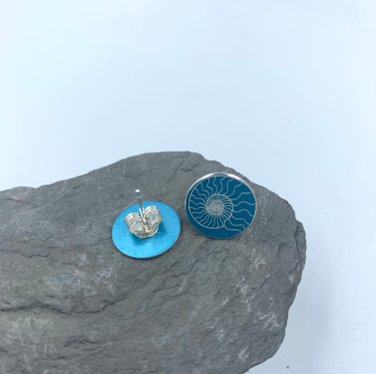 These stud earrings are from my ‘Anning collection’ which was inspired by a visit to the ammonite pavement in Lyme Regis. The design was drawn by me digitally then laser etched onto hand painted anodised aluminium. The ear post and back are sterling silver.