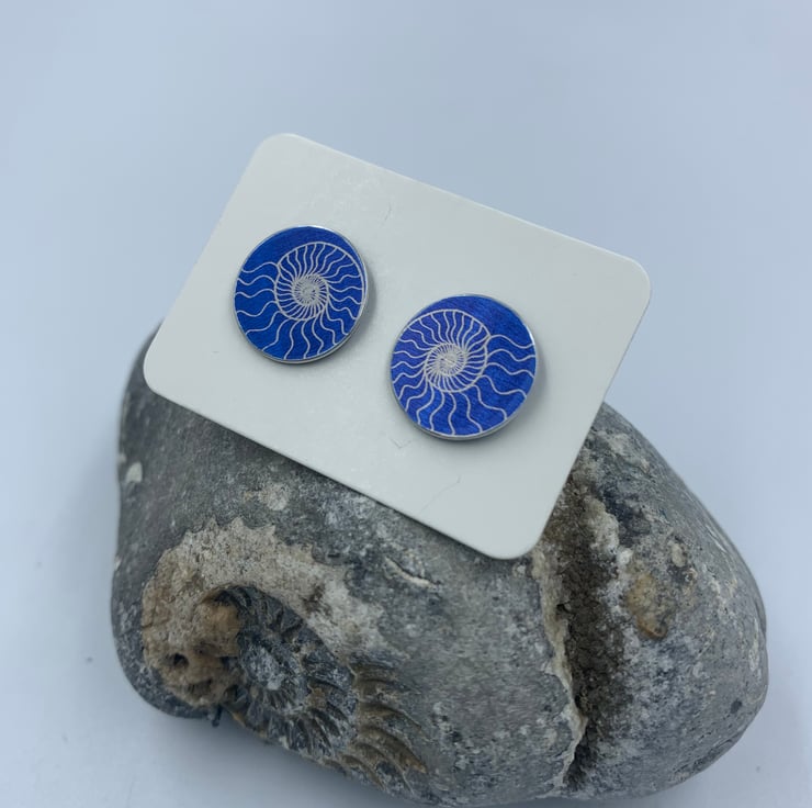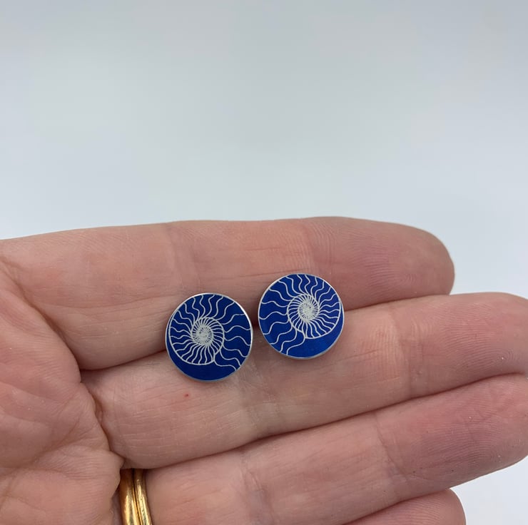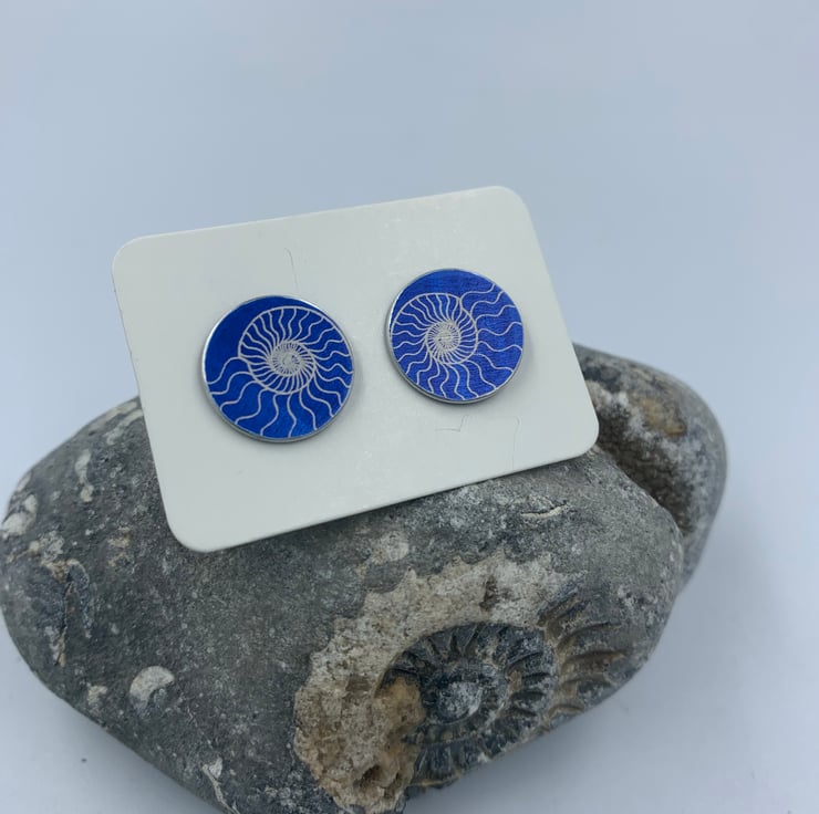 These stud earrings are from my ‘Anning collection’ which was inspired by a visit to the ammonite pavement in Lyme Regis. The design was drawn by me digitally then laser etched onto hand painted anodised aluminium. The ear post and back are sterling silver.