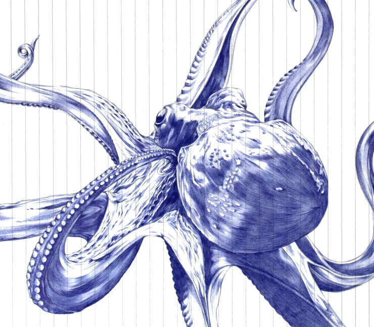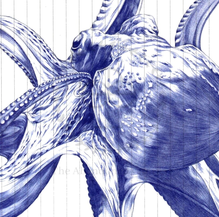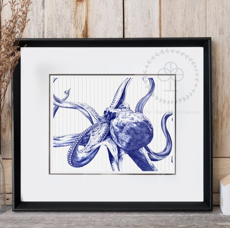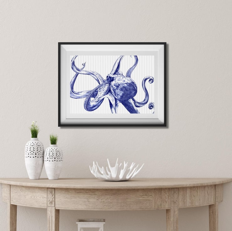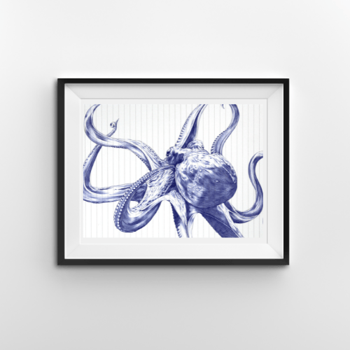 Eco-Conscious Art: This mesmerising octopus art print pays tribute to nature and eco-consciousness. Originally hand-drawn using a blue ballpoint pen on recycled note paper, it embodies Jessica’s steadfast commitment to preserving the environment through art.