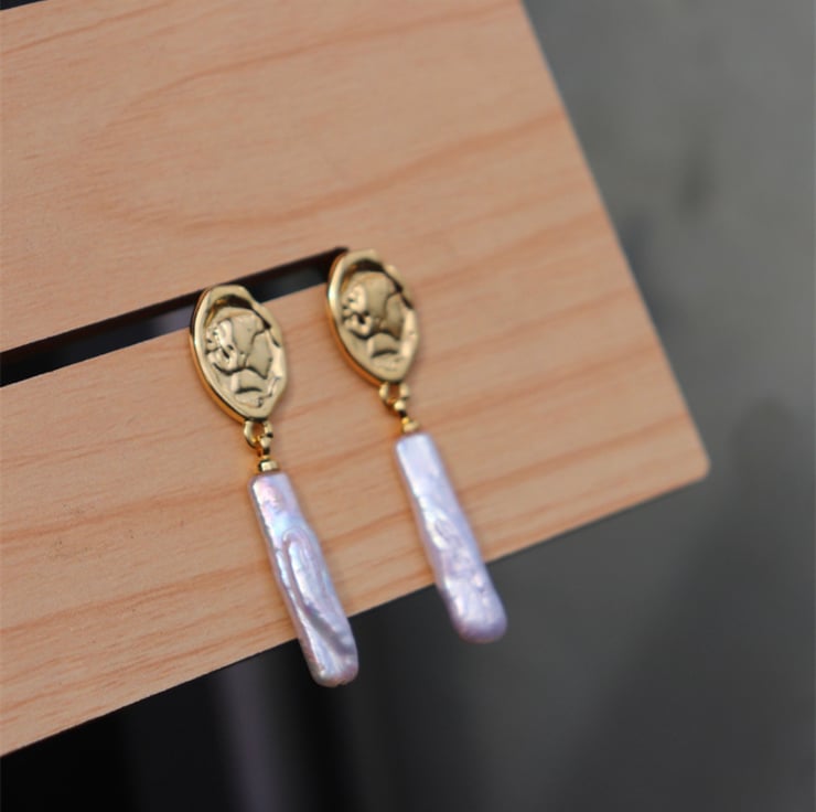 This earring has no extra accessories, just a gold-plated copper portrait and an irregular strip of freshwater pearls. It is very suitable for ladies with a minimalist style. Although it is simple, it is elegant.