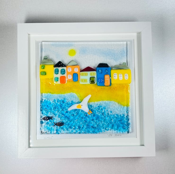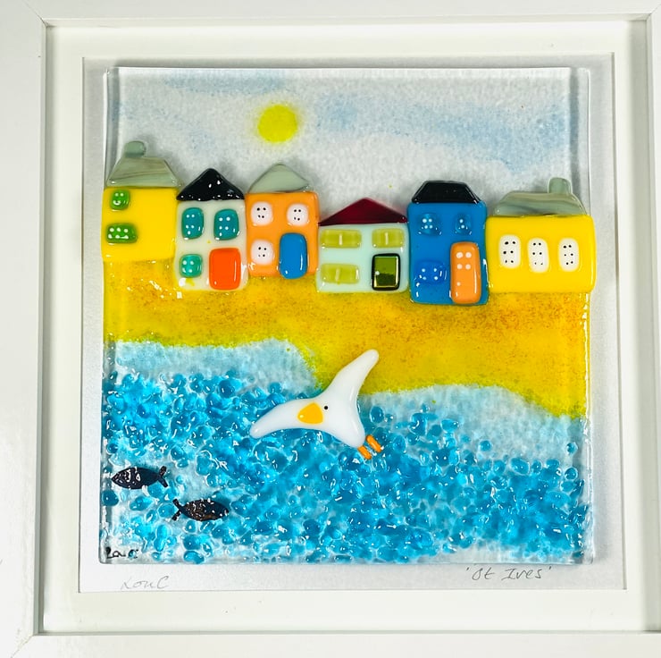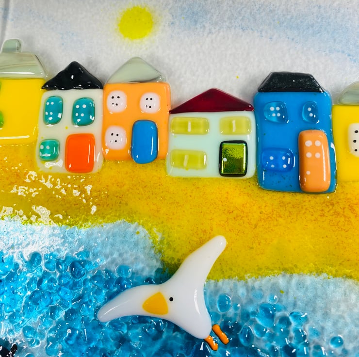 Cute and vibrant beach scene created entirely from fused glass and mounted on a 15cm frame . The picture is sure to add interest anywhere in the home .