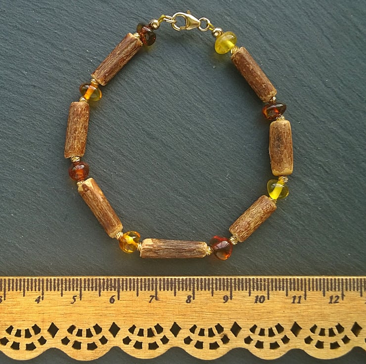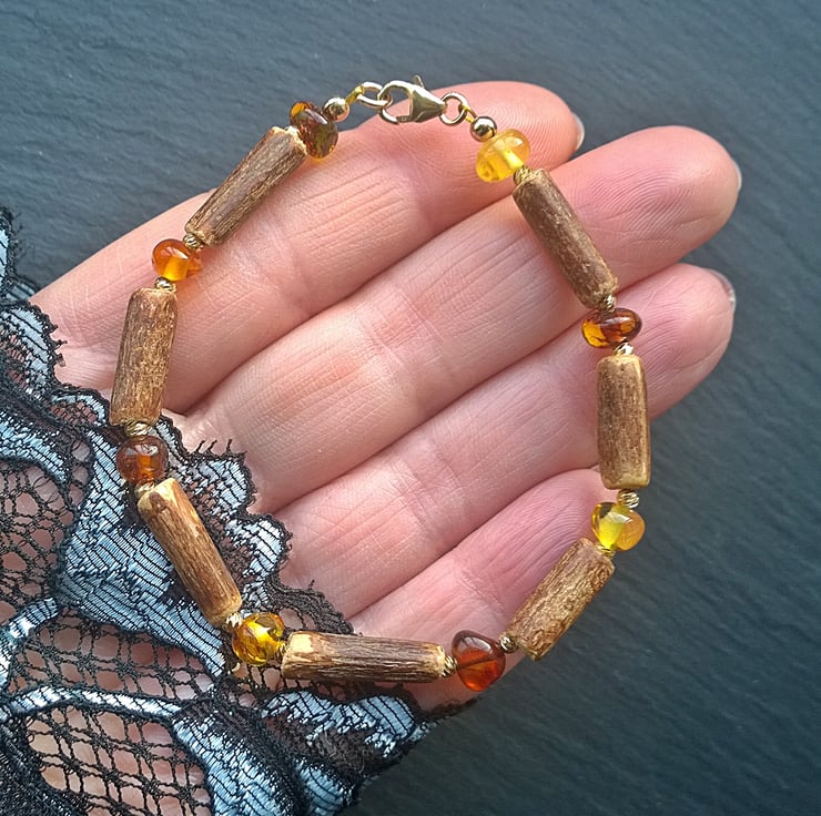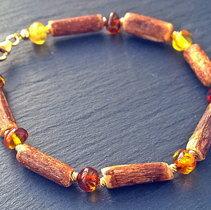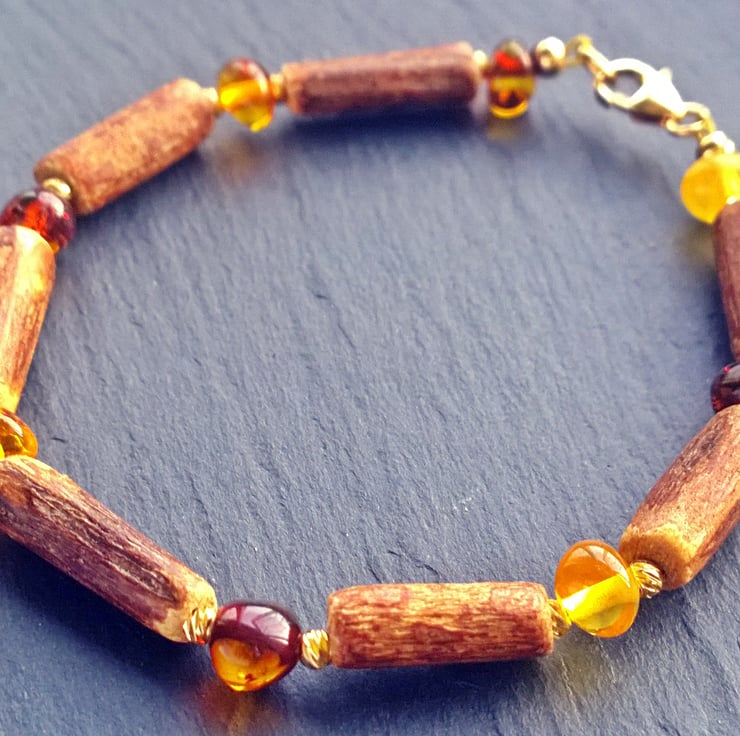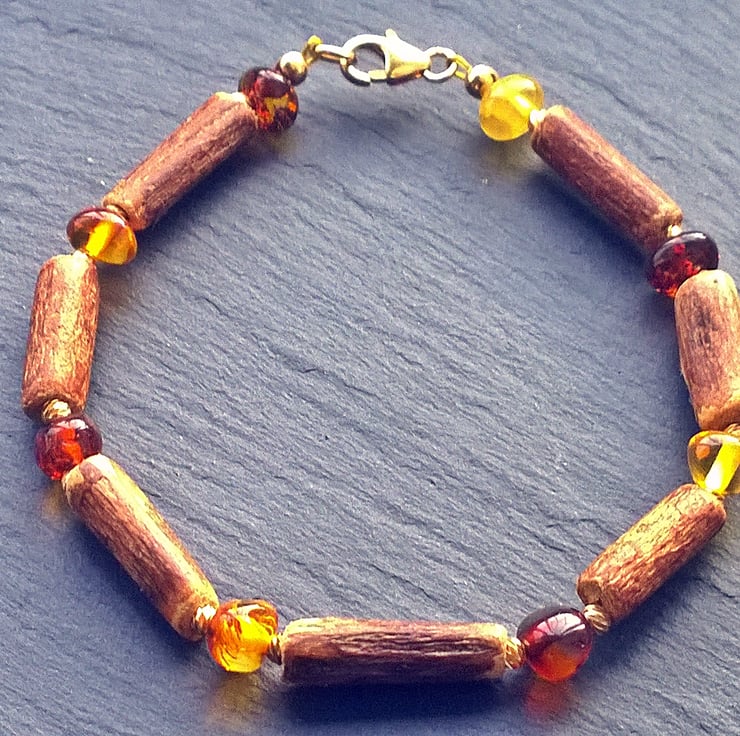 A warm to the touch, easy to wear bracelet made from genuine natural Baltic amber nugget beads and natural hazel wood tube beads. I have used some diamond cut 2mm gold plated beads either side of the amber to add a little light. The clasps and all other fittings are gold filled.