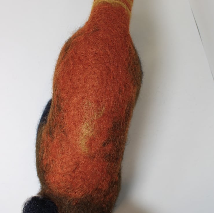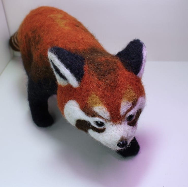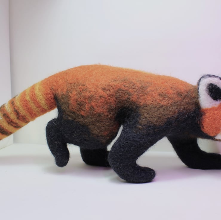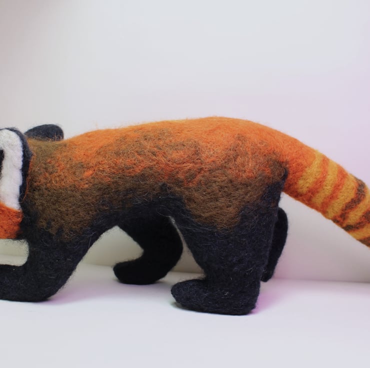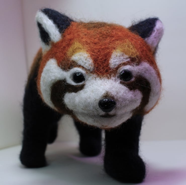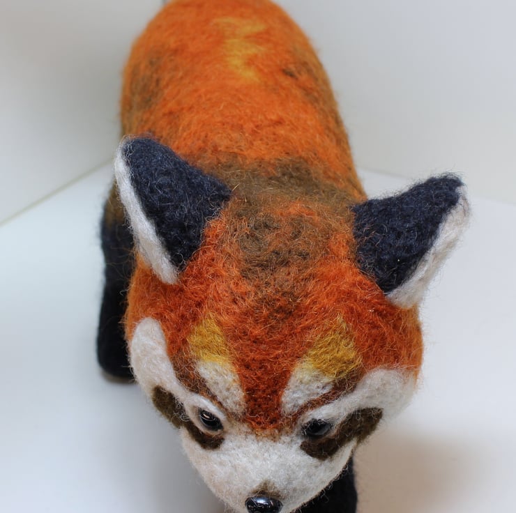 This large felted red panda, of extraordinary quality, captures the movement and expression of such an adorable, and clumsy, animal. It's made from mostly recycled wool, with shiny eyes and nose. Made from tightly compacted wool it weighs a hefty 386g. It took weeks, if not months to painstakingly create by hand.