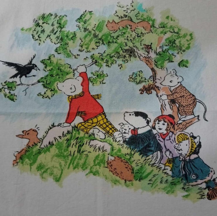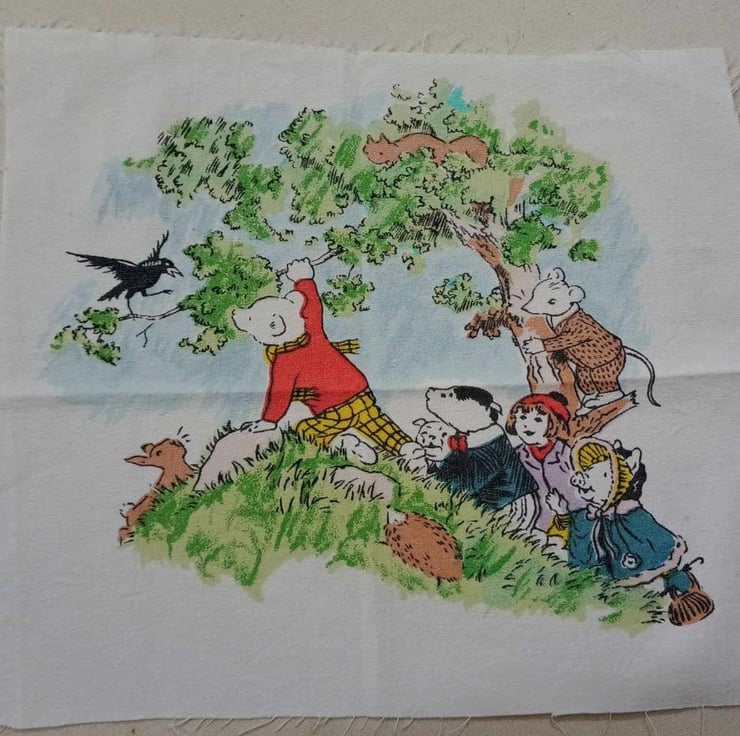 A vintage fabric panel featuring Rupert Bear talking to the blackbird, surrounded by his friends and woodland animals. This little panel would look stunning framed as a print or made into a little cushion. Or why not sew it into a book bag and pop in a Rupert annual to make a great Christmas gift for your little book worm.