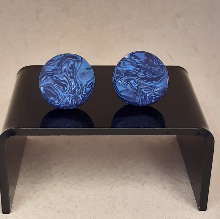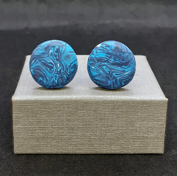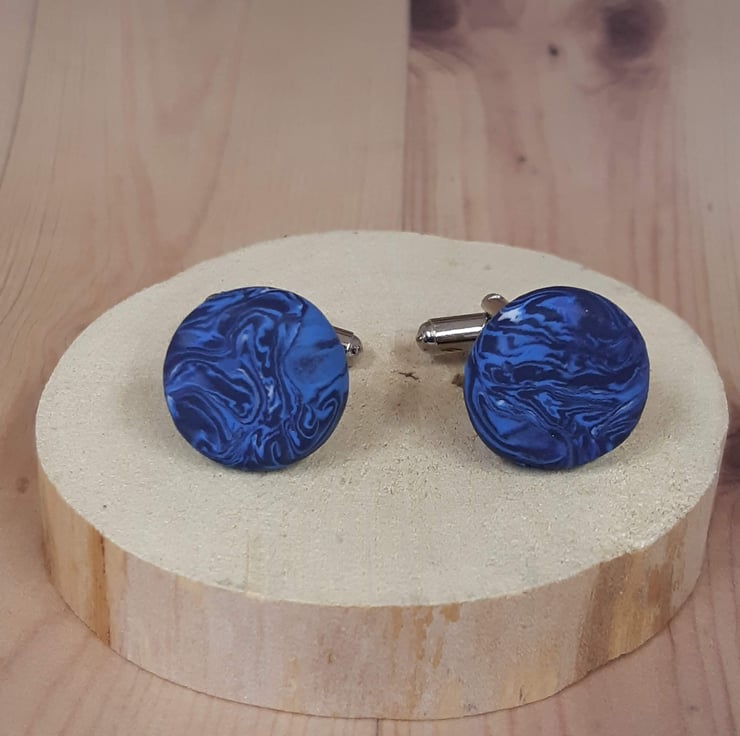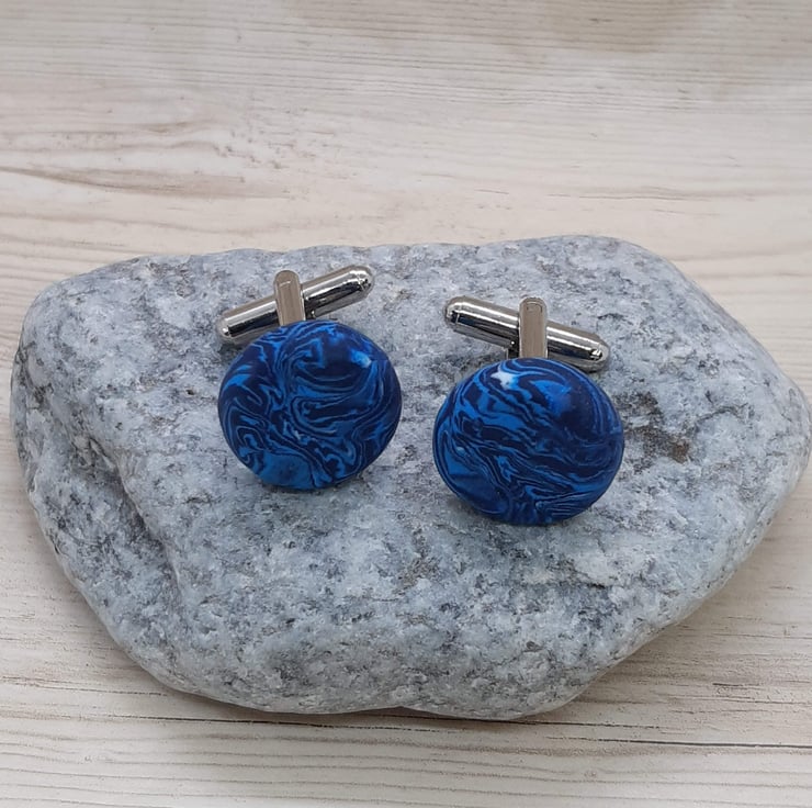 Handmade cufflinks using a mixture of navy and bright blue polymer clay to create this unique swirl design.