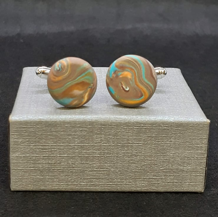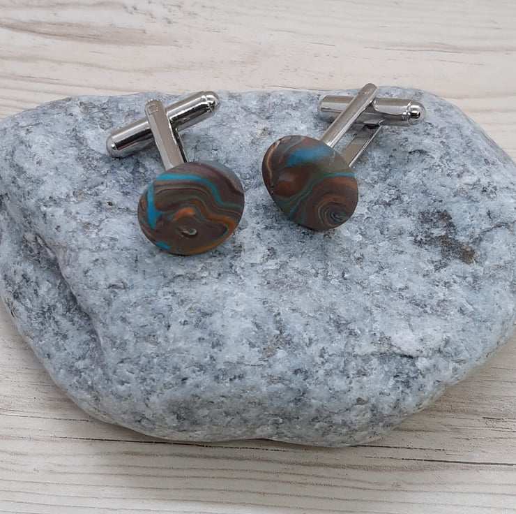 Handmade cufflinks using a mixture of brown, turquoise and orange polymer clay to create this unique swirl design.