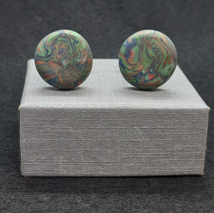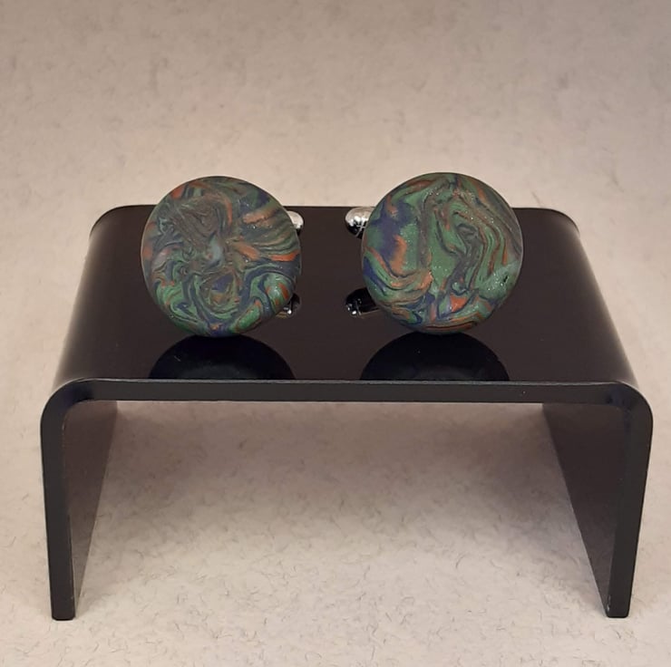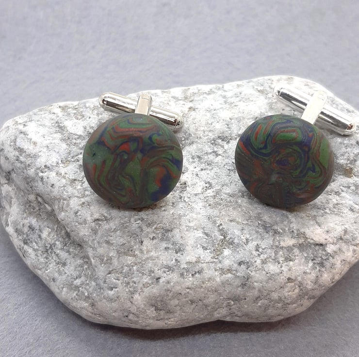 Handmade cufflinks using a mixture of dark green, navy blue and sienna polymer clay to create this unique swirl design.