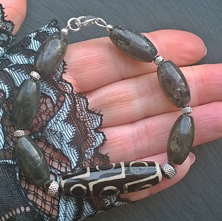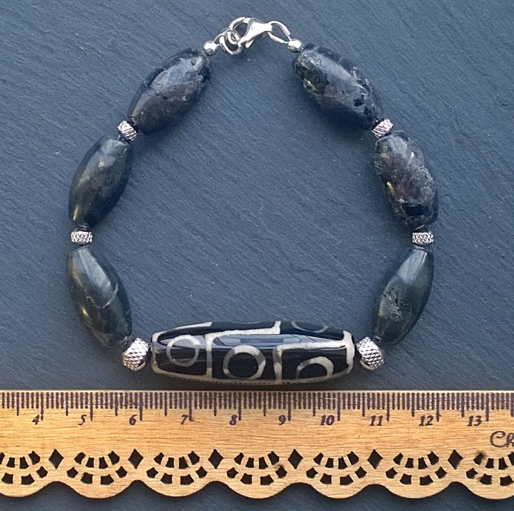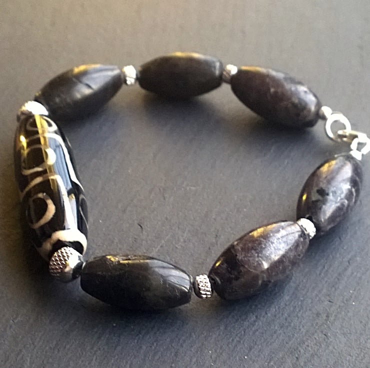 I have loved dzi beads ever since I found out their ancient meanings and try to match unusual beads with them to make them into unique bracelets. The off-black of the lightly patterned dark Indian agate nicely sets off the dzi bead and gives a chunky feel with their barrel shape, making this a bracelet suitable for unisex adults.