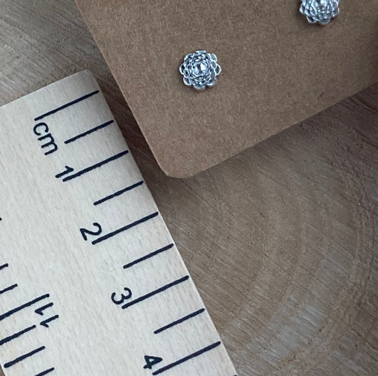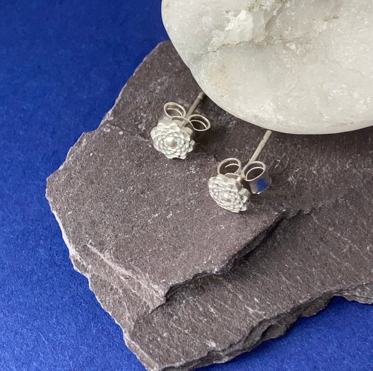 This cute little pair of silver flower stud earrings are formed from art silver clay to form a fine silver pieces. The flowers are round dahlia style with lots of petals arranged in circles.
