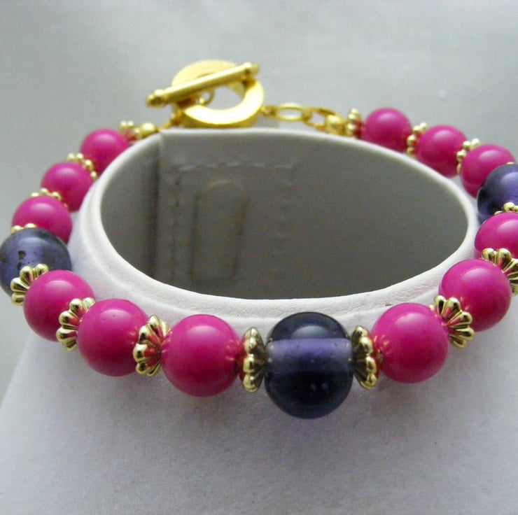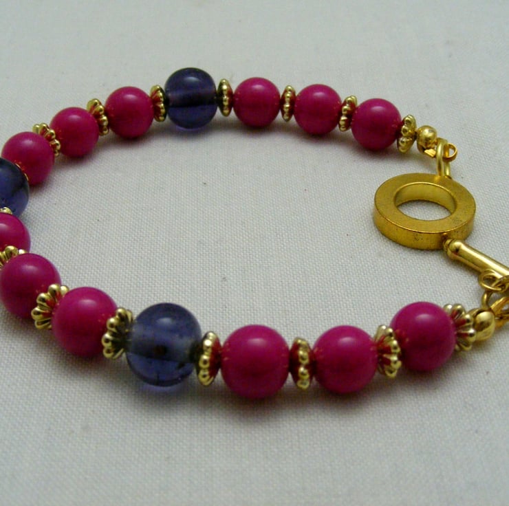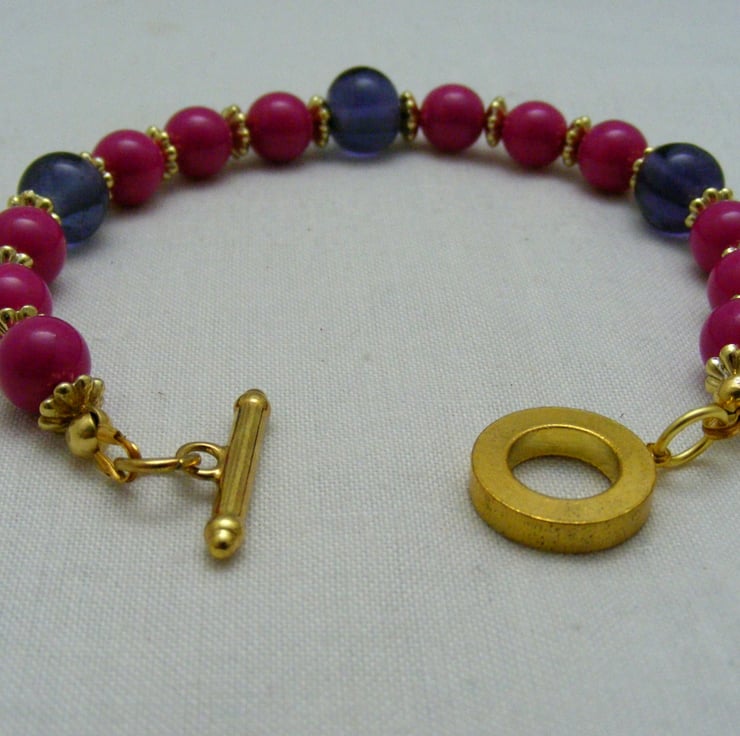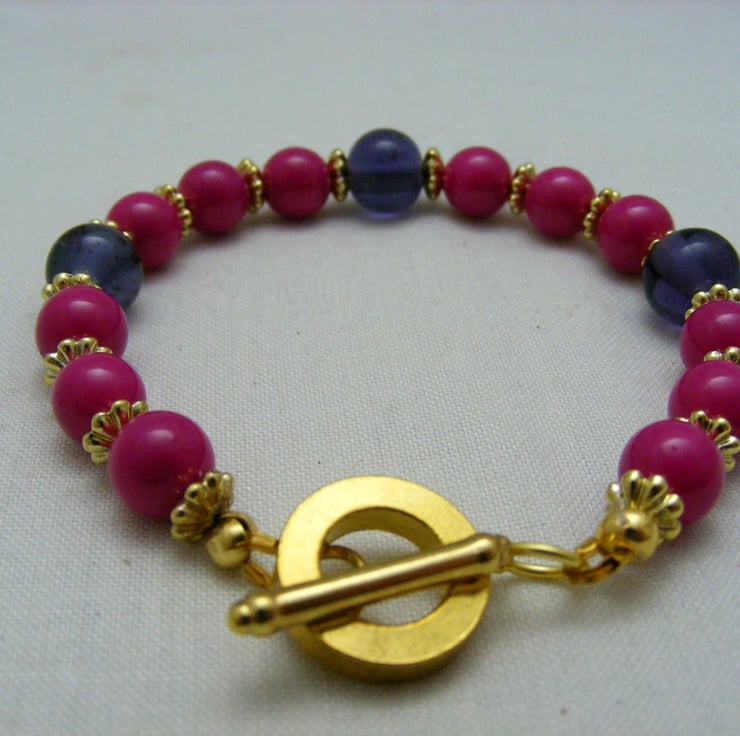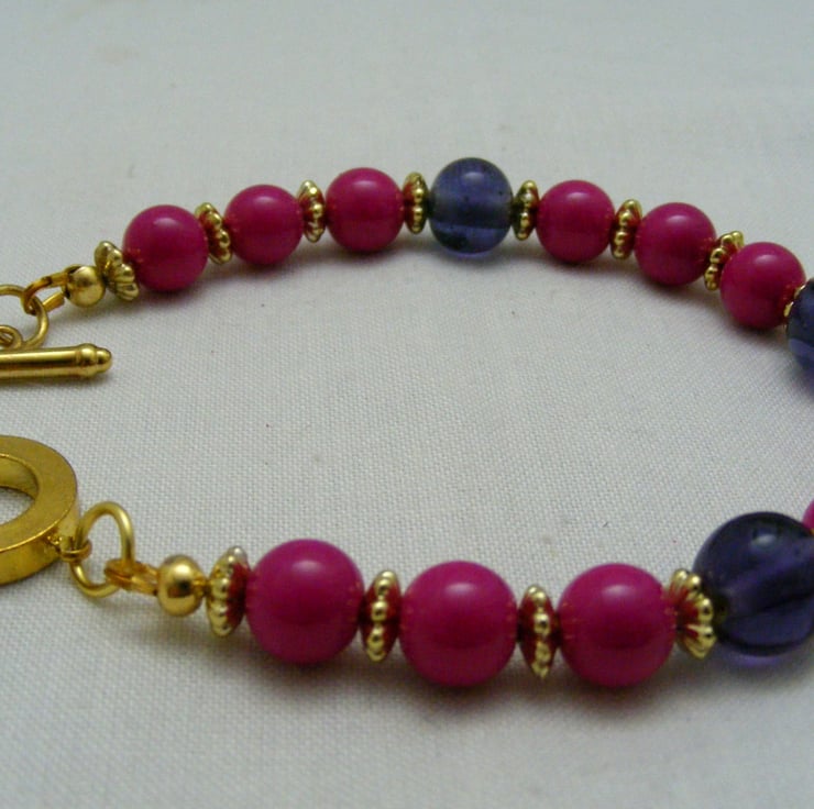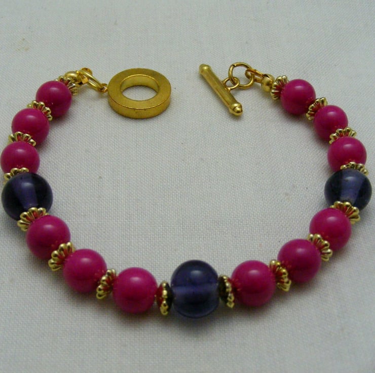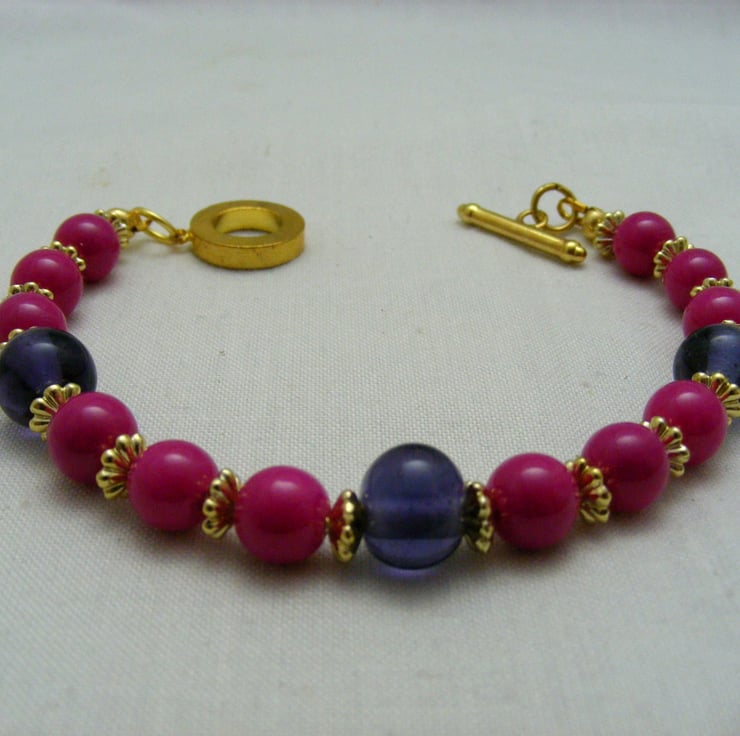 This lovely bracelet is handmade with, 8mm fuchsia glass rounds, 10mm purple glass rounds 5mm gold plated spacers and gold plated components.