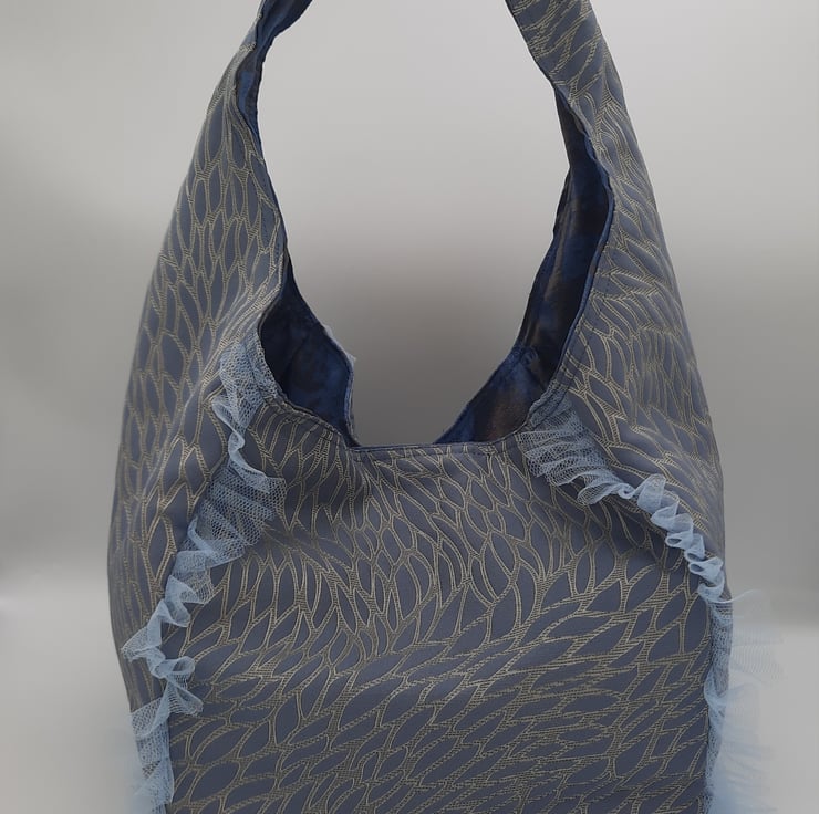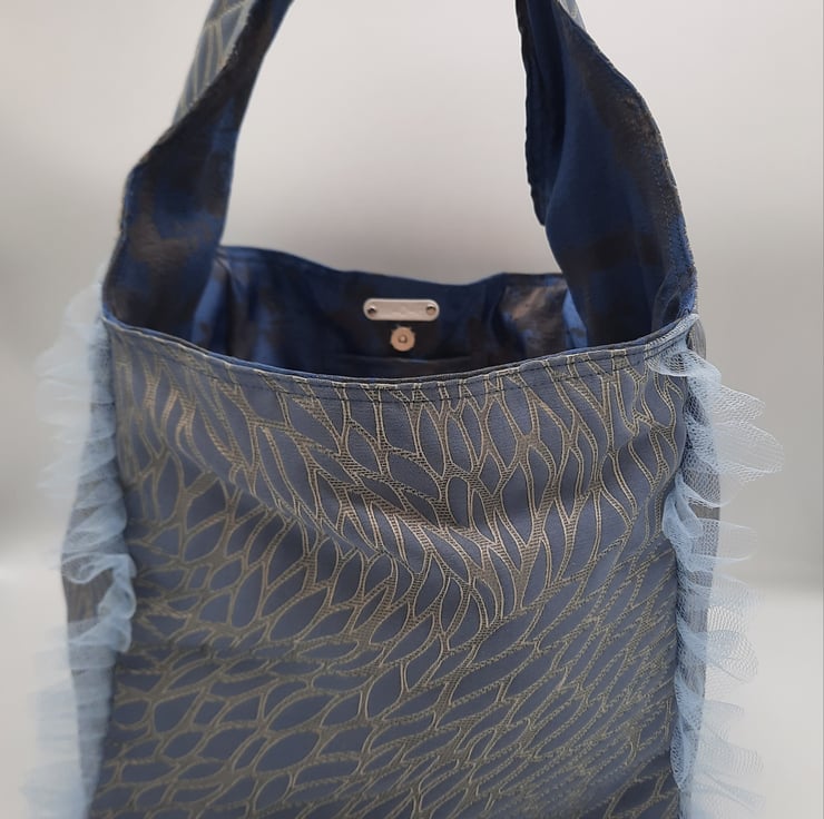 Cubed, one strap handbag made with a blue and beige pattern textured jacquard. Blue and bronze weaved lining, silver colour magnetic popper and matching feet studs.
