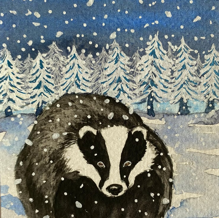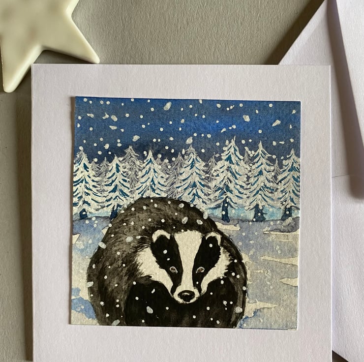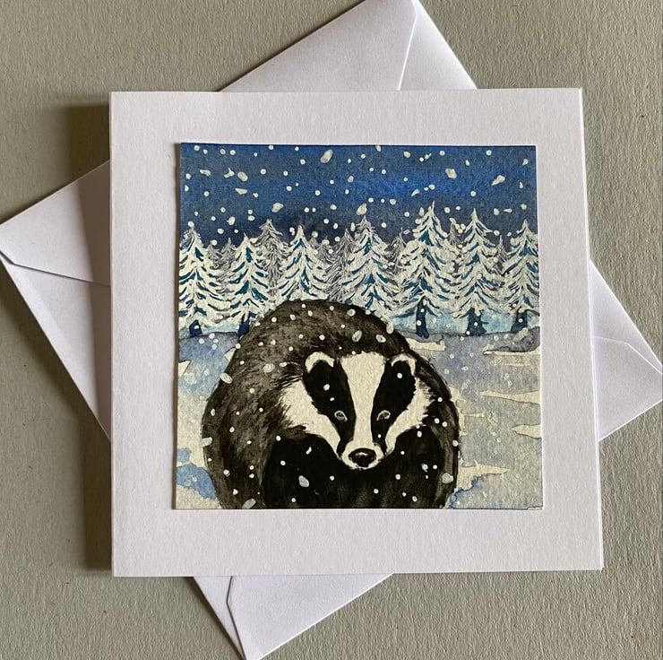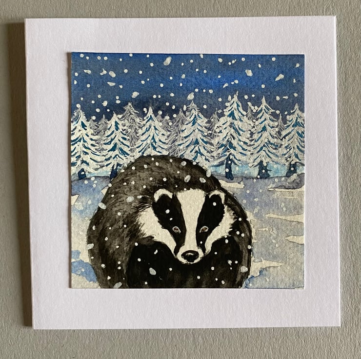 This greetings card measures 4” x 4” and the hand painted watercolour of a badger mounted on it measures 3” x 3”. It is blank inside for your own message and can be used for any occasion, including Christmas. Postage is free to UK destinations.
