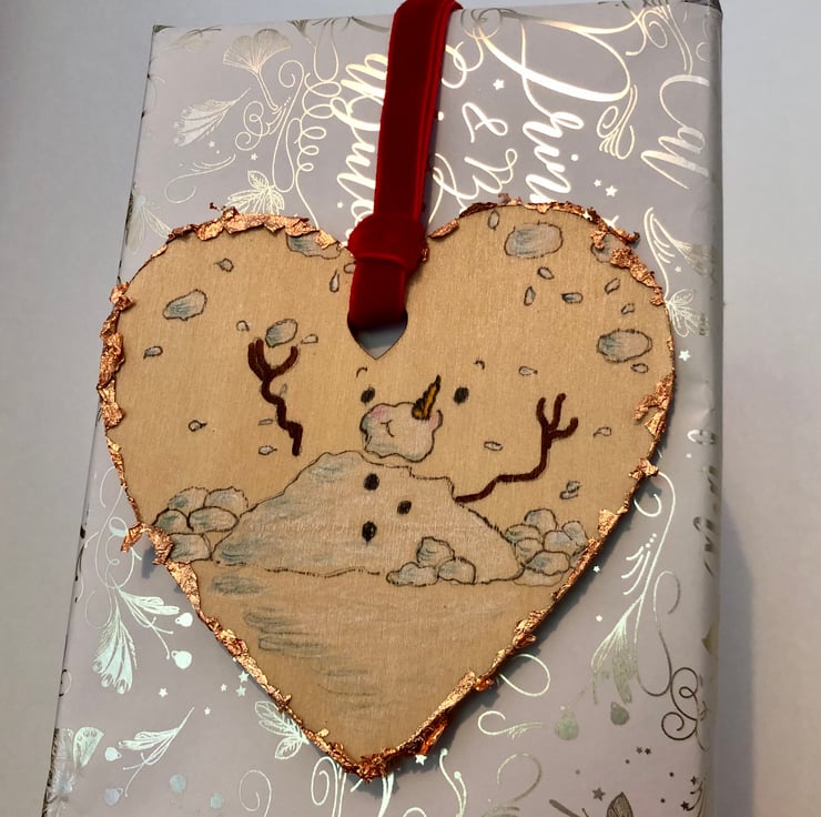 This cute Juggling Snowman Christmas decoration measures approximately 10x10cm and is a one-off item drawn by me. A velvet ribbon adds some festive glamour.