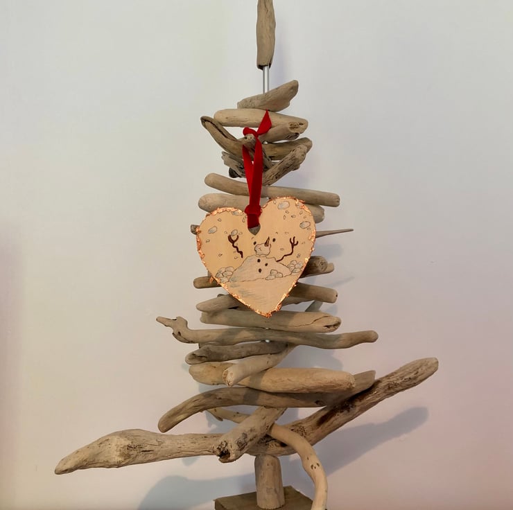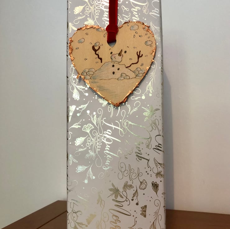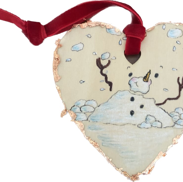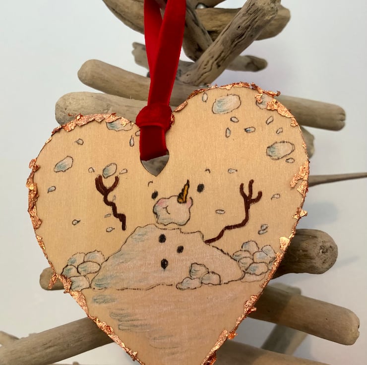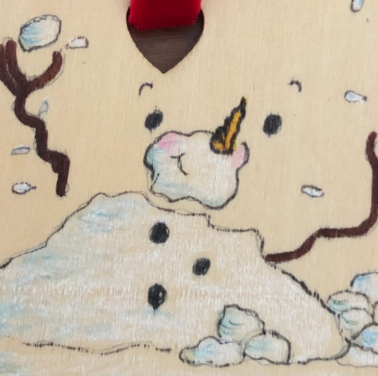 This cute Juggling Snowman Christmas decoration measures approximately 10x10cm and is a one-off item drawn by me. A velvet ribbon adds some festive glamour.