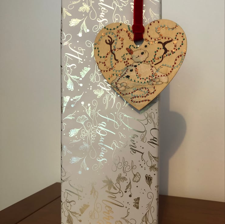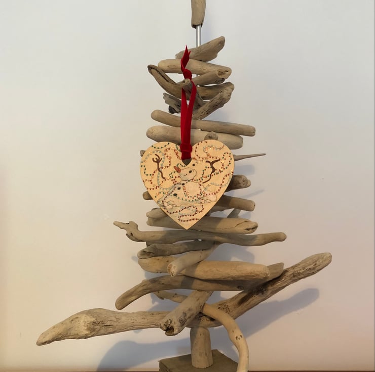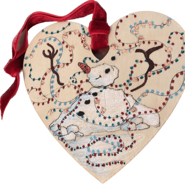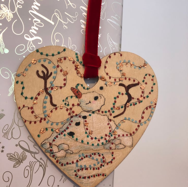 This one-off Christmas decoration has been drawn by me onto a wooden heart which measures approximately 10x10cm. For a bit of festive glamour, the decoration is hung up with a red velvet ribbon.