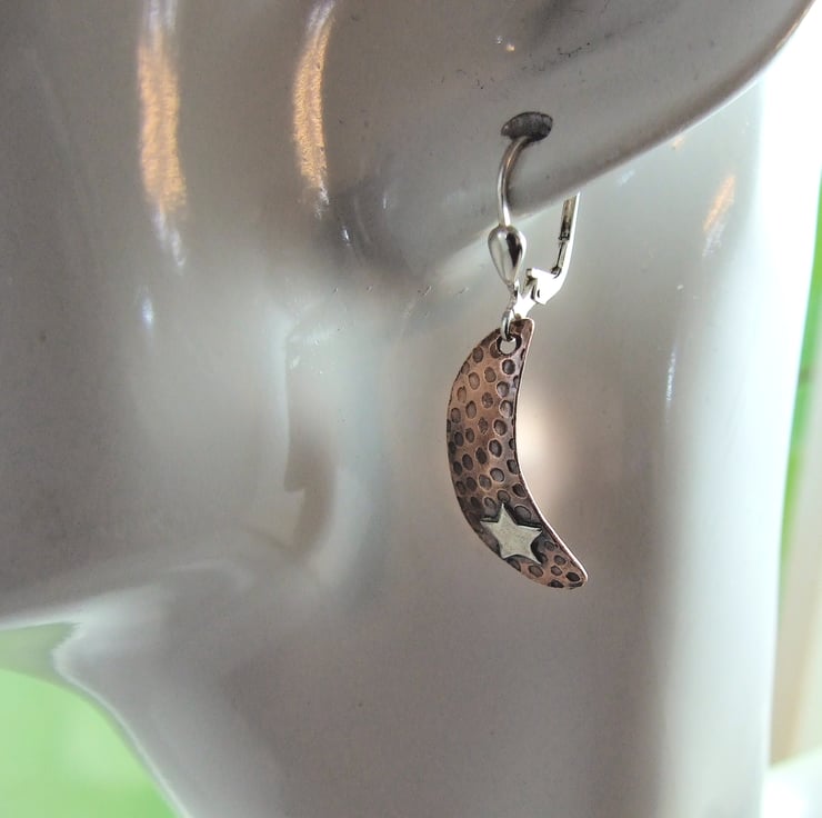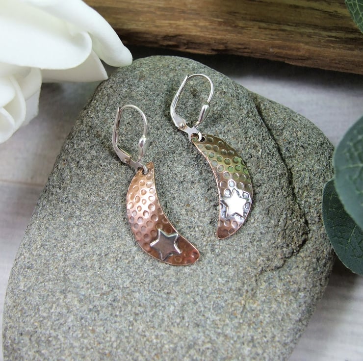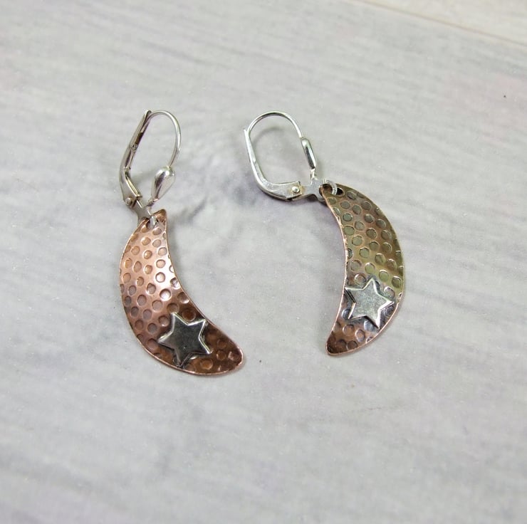 Sterling and Copper Moon and Star Dropper Earrings.