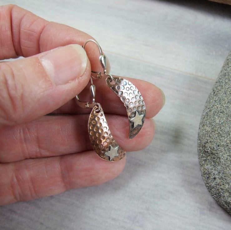 I have created the moon shapes from copper sheet, hand cut and textured with a pattern, I then slightly domed the shape and then soldered on some sterling silver stars. Fitted to sterling silver ear french style wires.