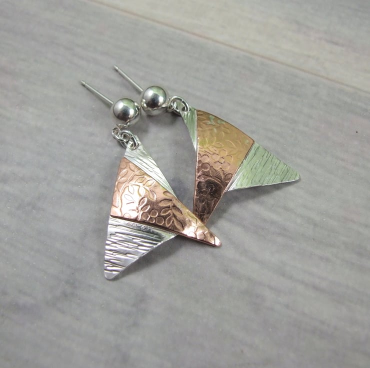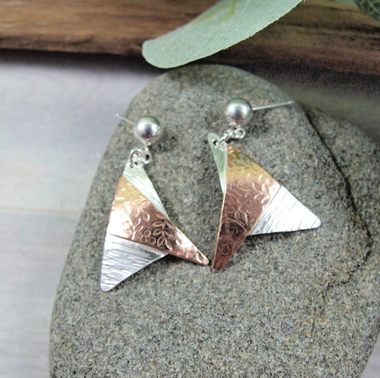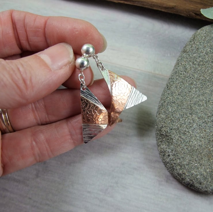 I have created the copper and silver shapes from sheet metal, hand cut and textured with different patterns, I then soldered them together and slightly domed the shape. Fitted to sterling silver ear stud posts.