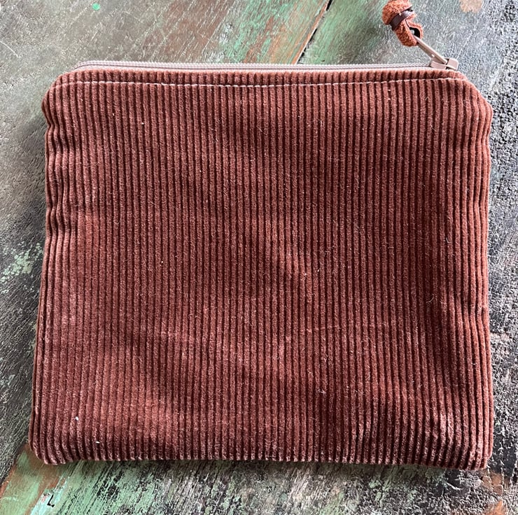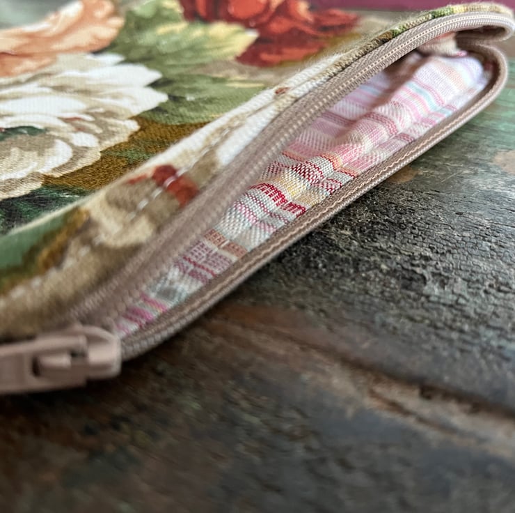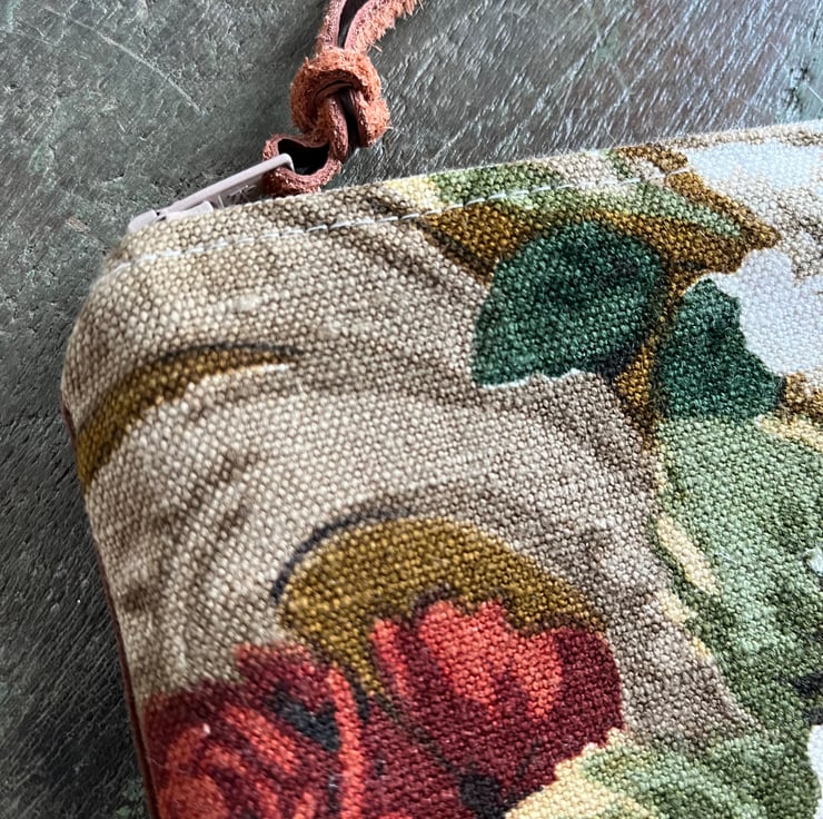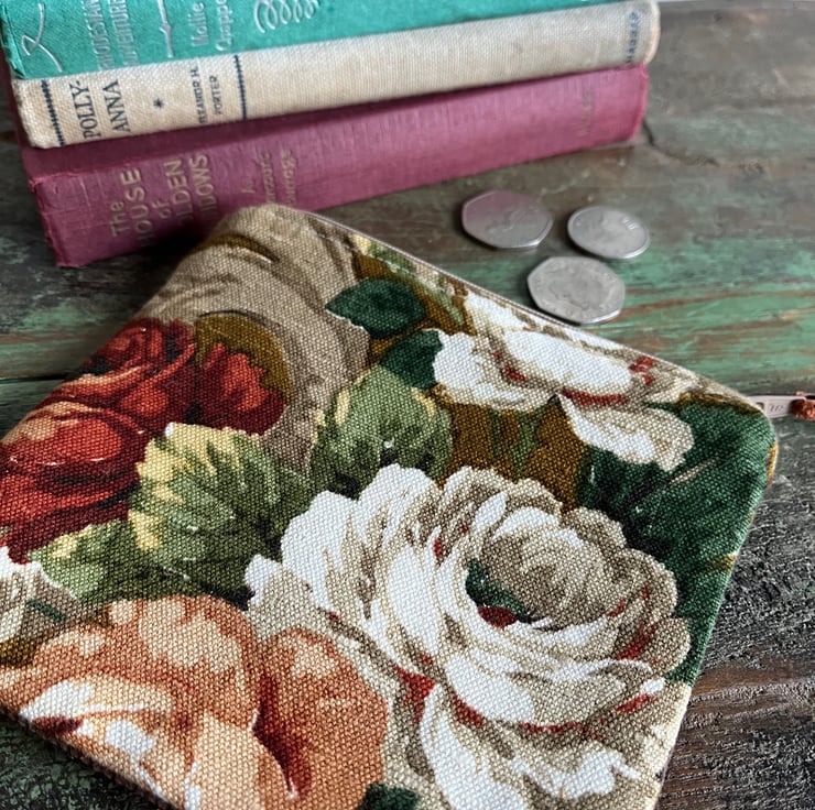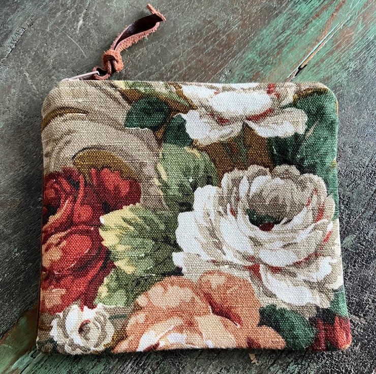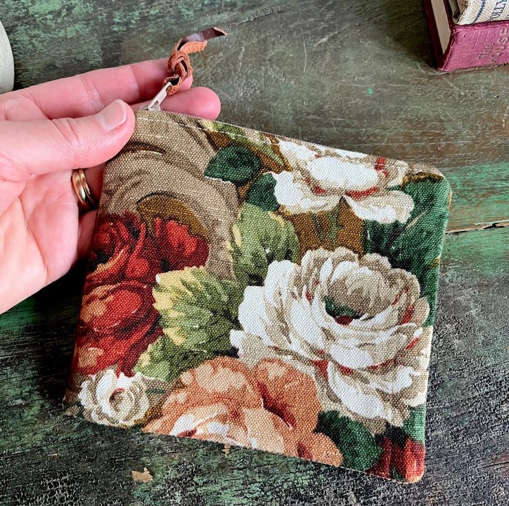 Pretty coin purse made from reclaimed vintage floral linen. This heavy linen fabric was previously a pillow cover but the colours are still strong. It is backed with brown corduroy from a sample swatch and it is lined with stripy cotton.