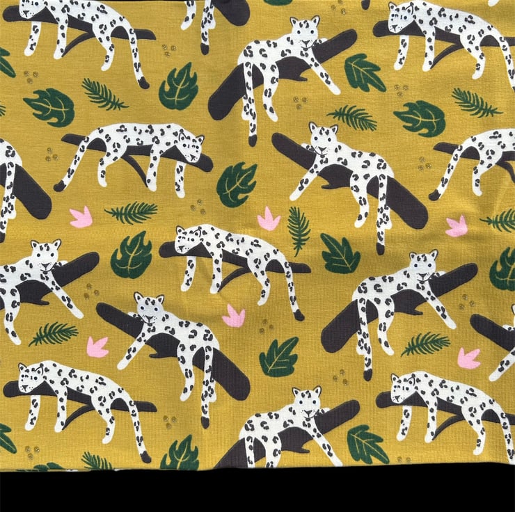Super Soft Jersey Cotton fabric with Lycra has been used to make this gorgeous ochre Infinity Scarf with leopard design and a subtle little sparkle.
