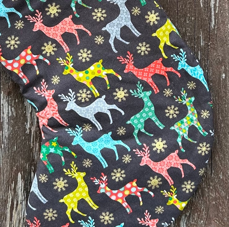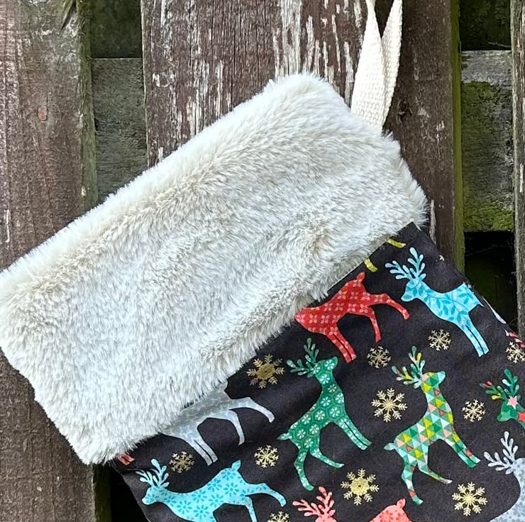Cotton Reindeer fabric Christmas Stocking lined with cotton, cotton wadding and topped off with super soft fluffy faux fur.