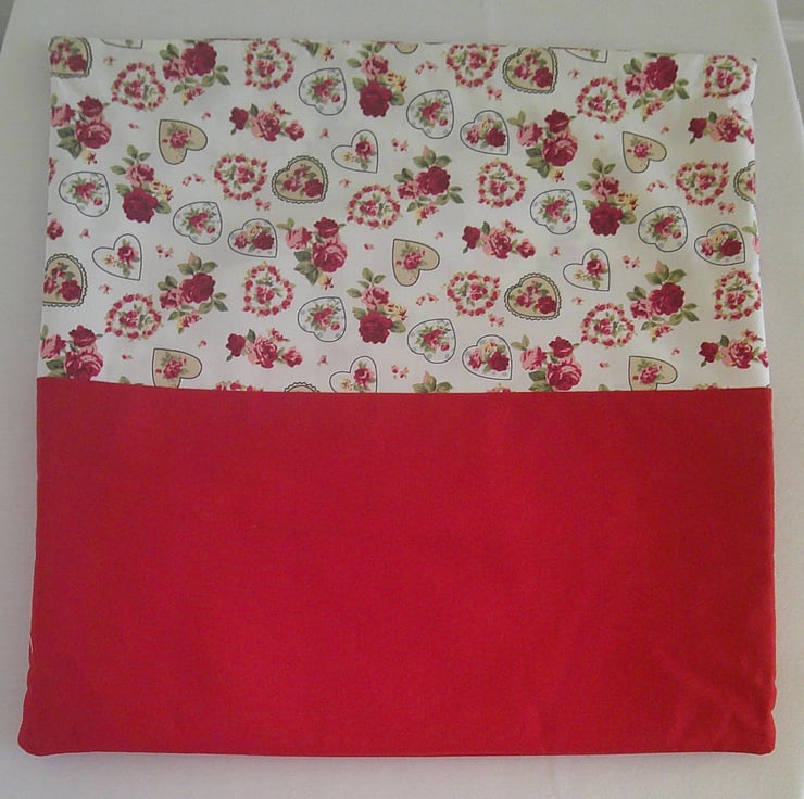 The pocket front is red and the fabric is 100% cotton featuring hearts and flowers.