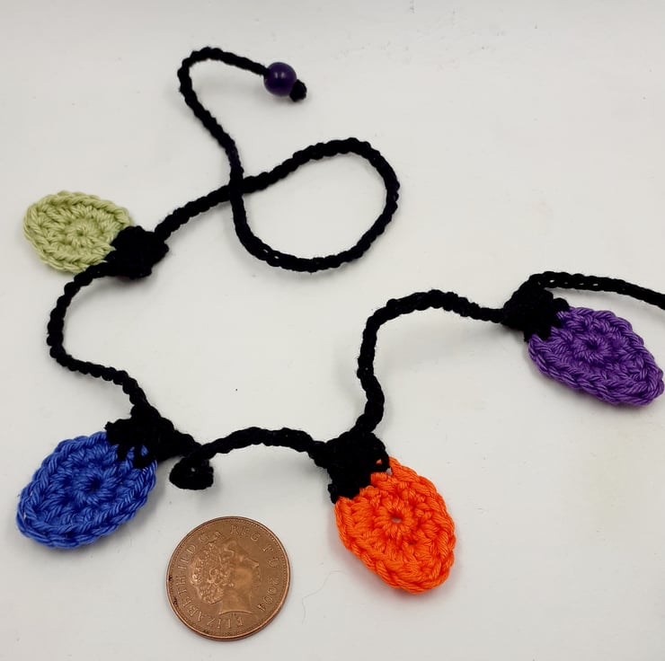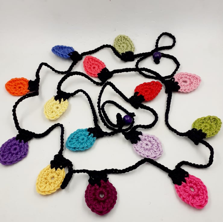 This dainty garland is crocheted in cotton and the ends are finished with a wooden bead for easy tying. The whole garland measures approximately 150cm and comes wrapped in tissue in a labelled PIP (Postage in Proportion) box all ready to be given or posted on as a gift if required. A tag with wording of your choice can be added to the box to make this a novel alternative to a greetings card .