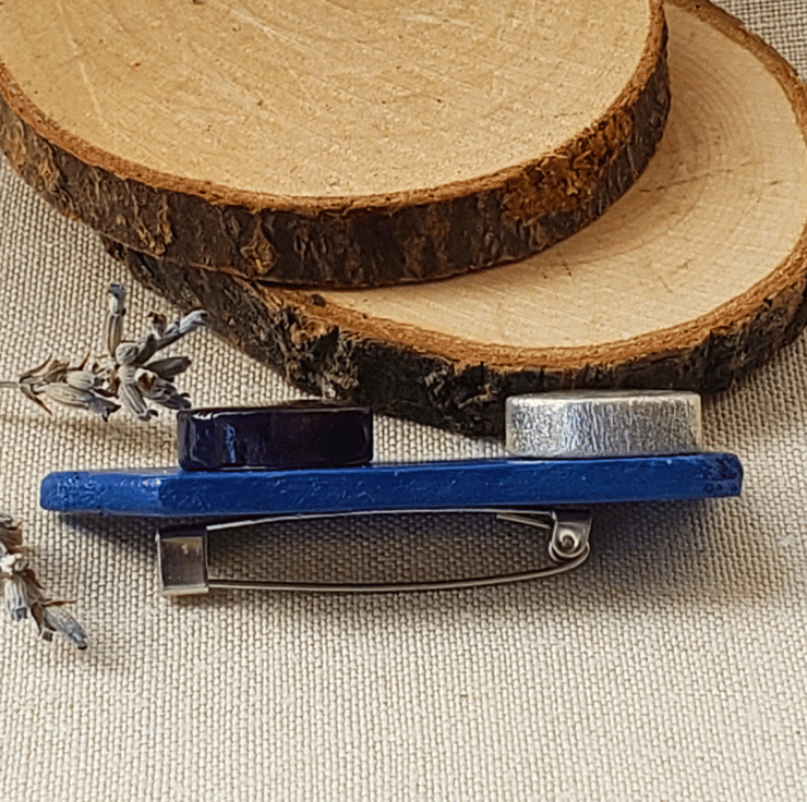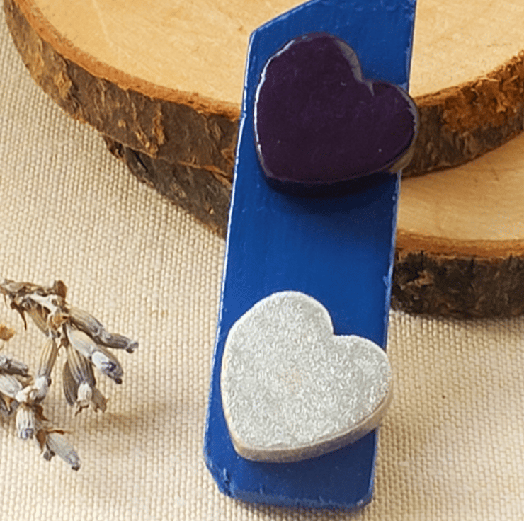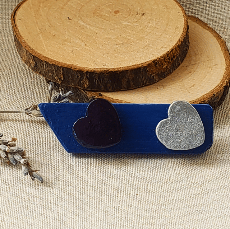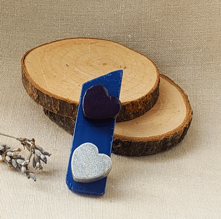 Made using wooden canvas pegs and recycled wooden heart shapes with acrylics. I've created some unique colours using different types of acrylics, the background is a deep blue and the two hearts are a rich purple and silver. The silver heart is textured, a result of mixing different paint types.