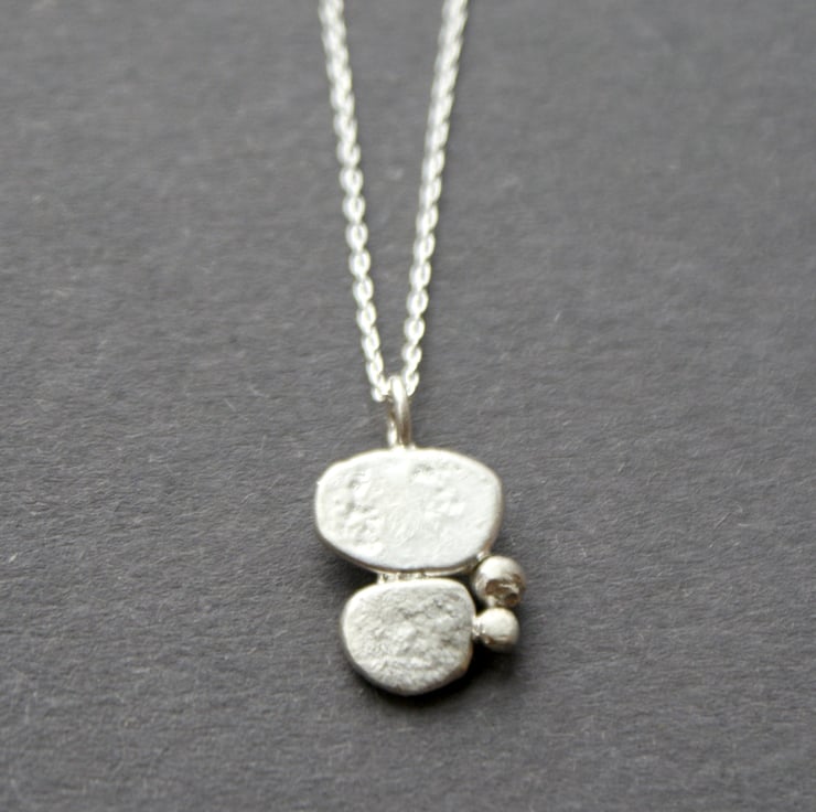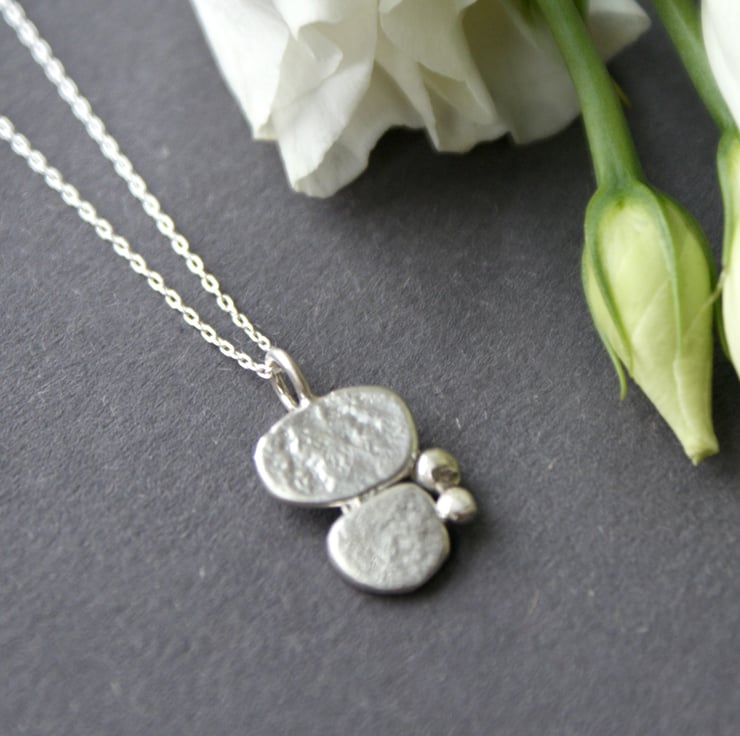 Perfect for that special someone, this cute pendant can be personalised with up to 2 initials of your choice. It is made by hand by recycling sterling silver off cuts that are melted into pebble shapes, and soldered together and polished to a satin finish.