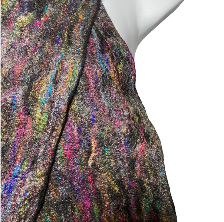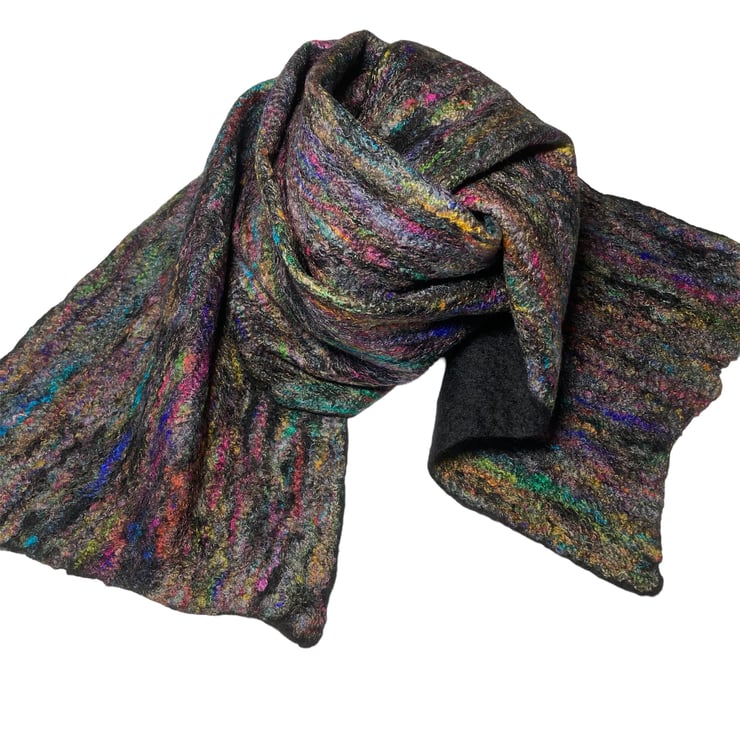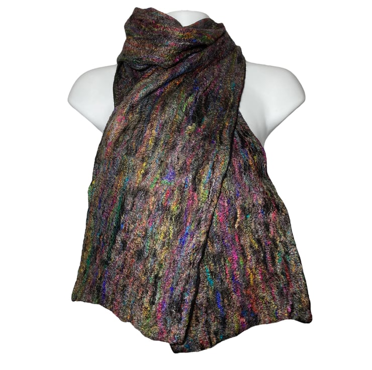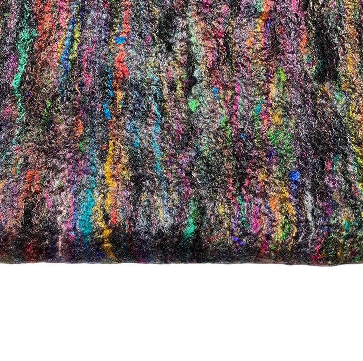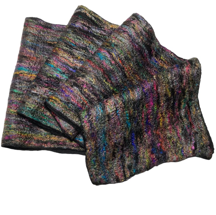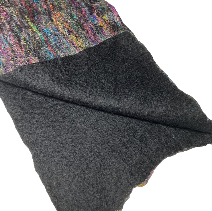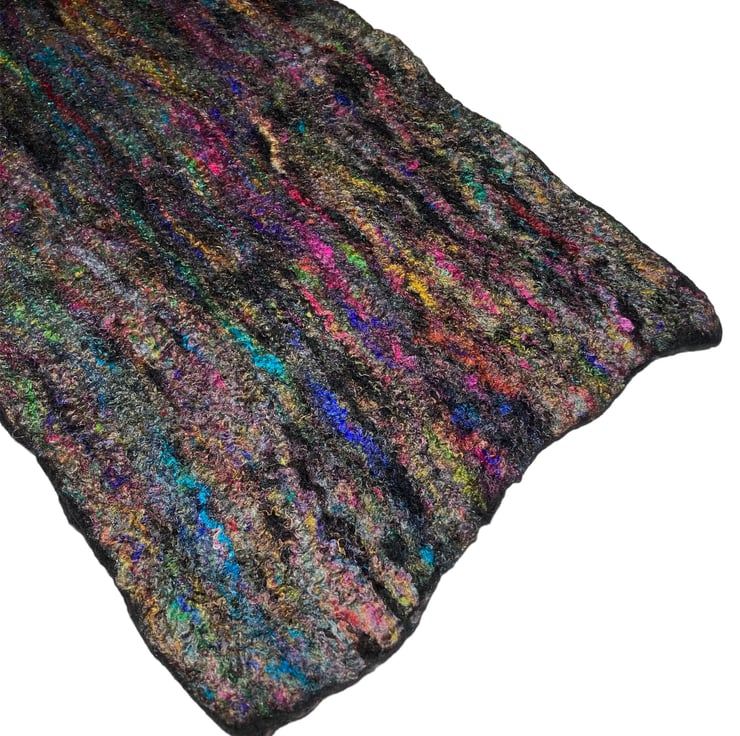This gorgeous scarf has been made using black merino wool fibres with a layer of multicoloured recycled sari silk fibres added to one side. Fine layers of black merino wool topped with multicoloured recycled sari silk fibres have been wet felted to create this scarf. The wet felting process causes the wool and silk fibres to bind together to make a stable fabric.