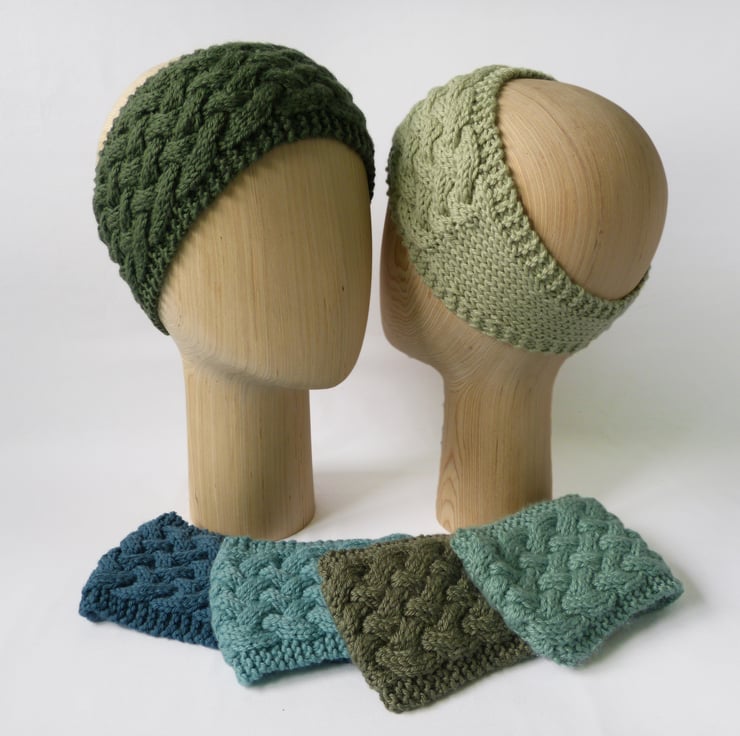 Foreground Left to Right: Blue Mist, Teal, (100% merino wool), Basil Green, Duck Egg, (merino, acrylic and cashmere blend)