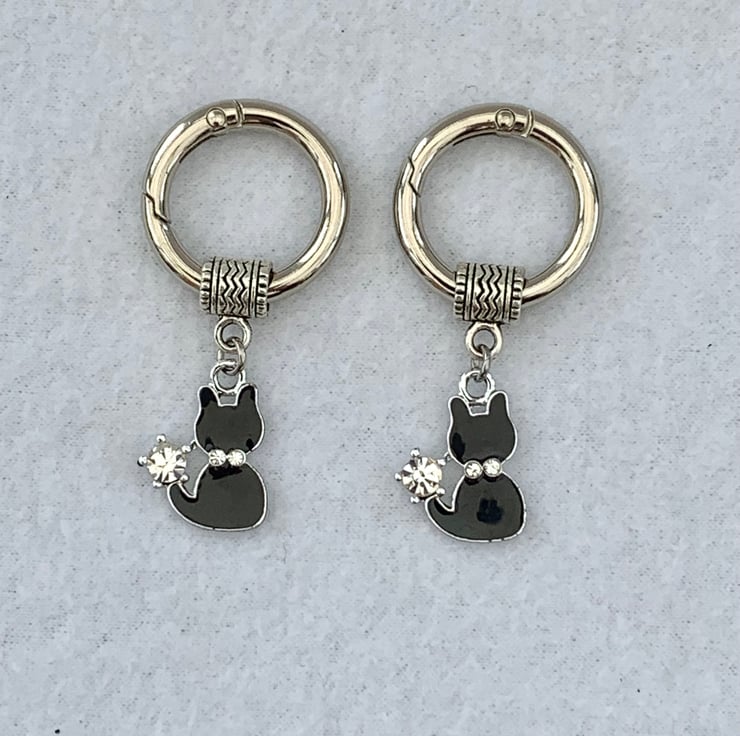 Alloy enamel black cat with rhinestone collar and tail pendant measuring 22 x 16 x 2mm fitted with a stainless steel jump ring (for strength and longevity) onto a decorative alloy pendant bail and hung from a platinum coloured zinc alloy spring O Rings measuring approximately 27mm outer diameter, 4mm thick with a 20mm inner diameter.