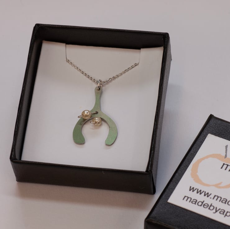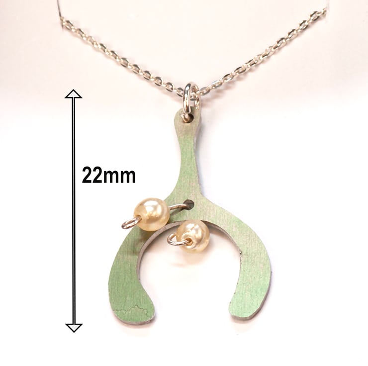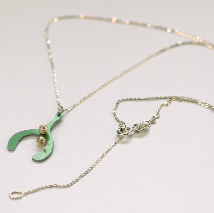 This delicate little mistletoe necklace is hand dyed and sawn from lightweight anodised aluminium. It comes on a fine chain made from recycled sterling silver and can be extended and worn as a 15.5 or 17.5 inch necklace. It has two tiny fake pearl beads to represent the mistletoe berries.
