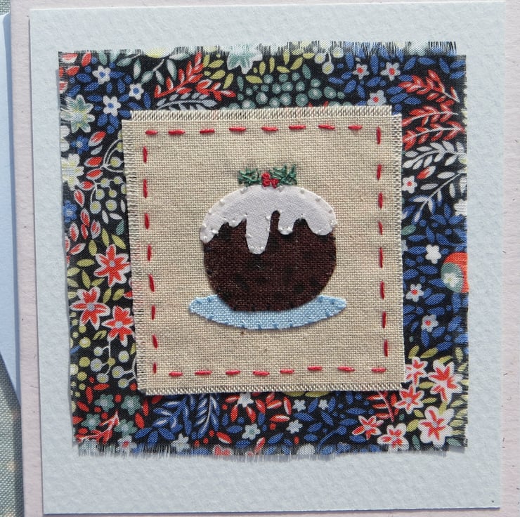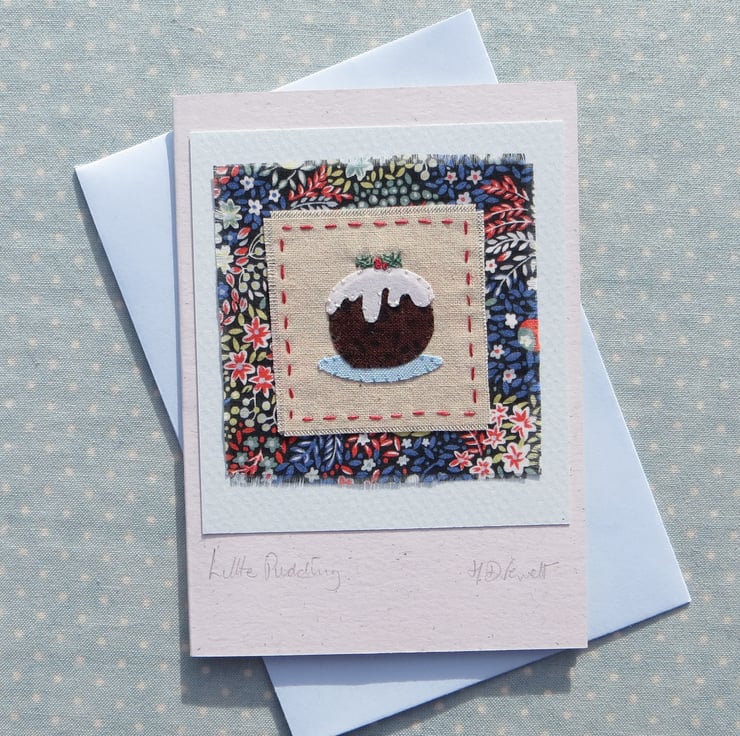 A miniature hand-stitched applique Christmas pudding with intricate embroidered details including holly sprig. Backing fabric is Liberty Tana Lawn cotton. A special little card to keep.