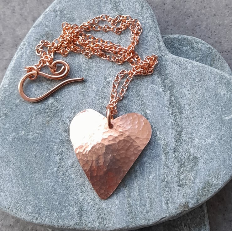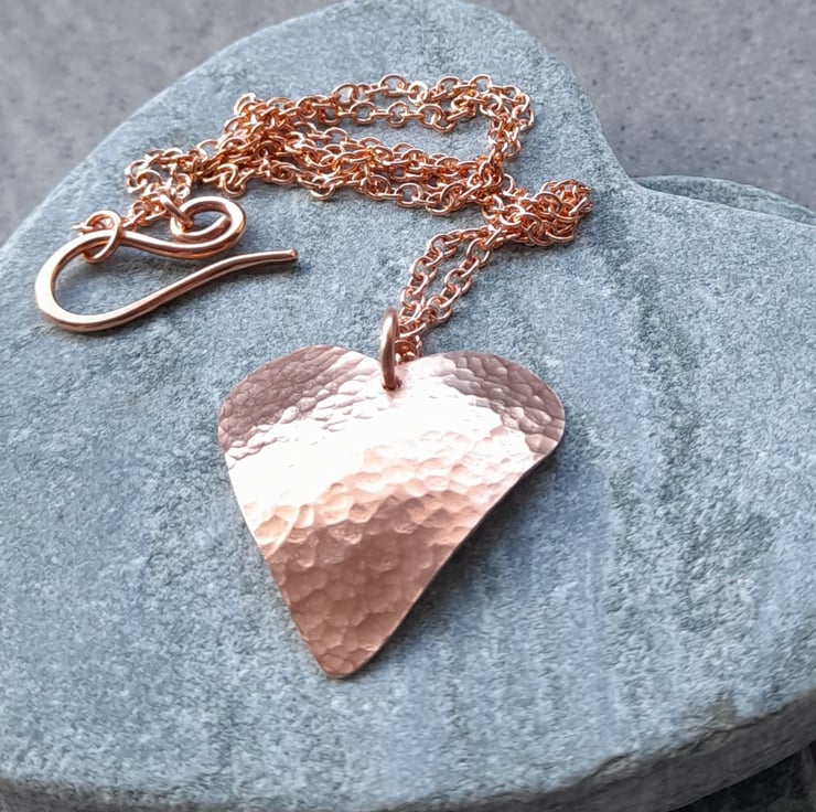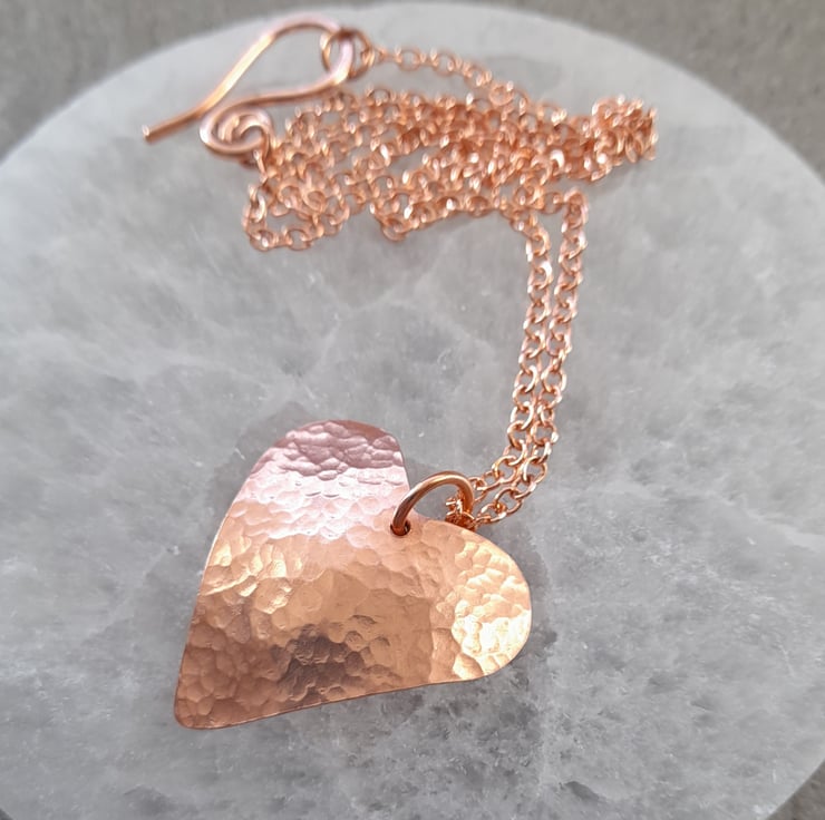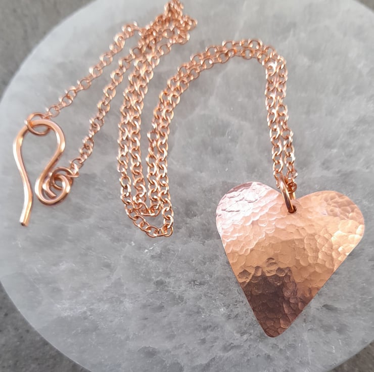 Copper heart pendant which has been hammered to texture the copper and slightly domed to give a slightly raised effect. the pendant has been attached to a copper chain with a handmade copper hook clasp.