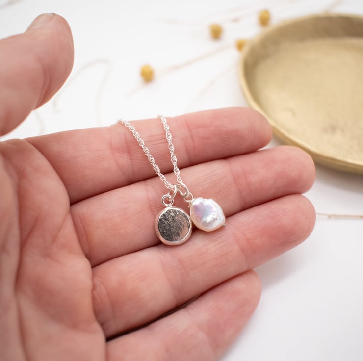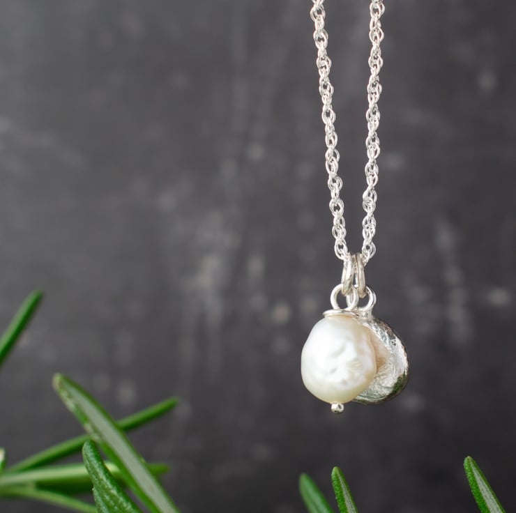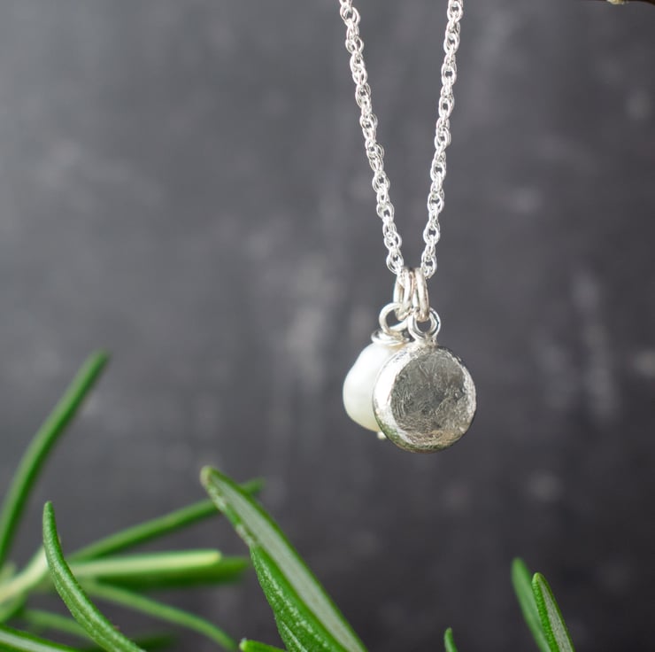 A contemporary, minimalist necklace featuring a single keishi pearl and handcrafted silver nugget clustered on a sterling silver chain. The nugget is formed from melted silver offcuts which forms a silver droplet, hammered to flatten and add texture. As such, please expect variation from the sample photo as each piece will be unique.