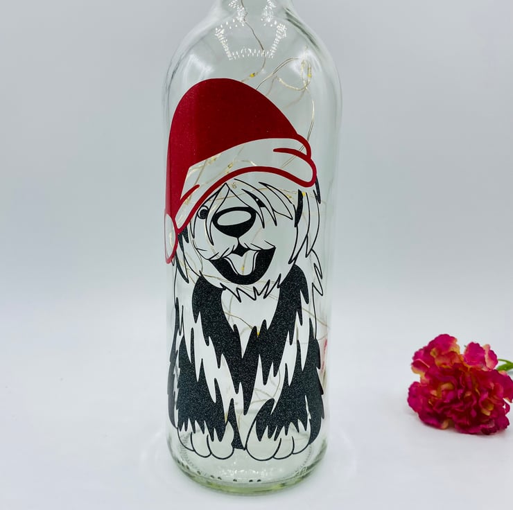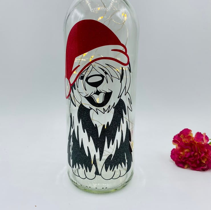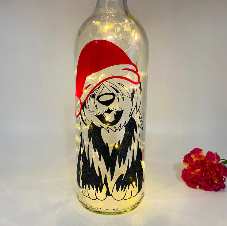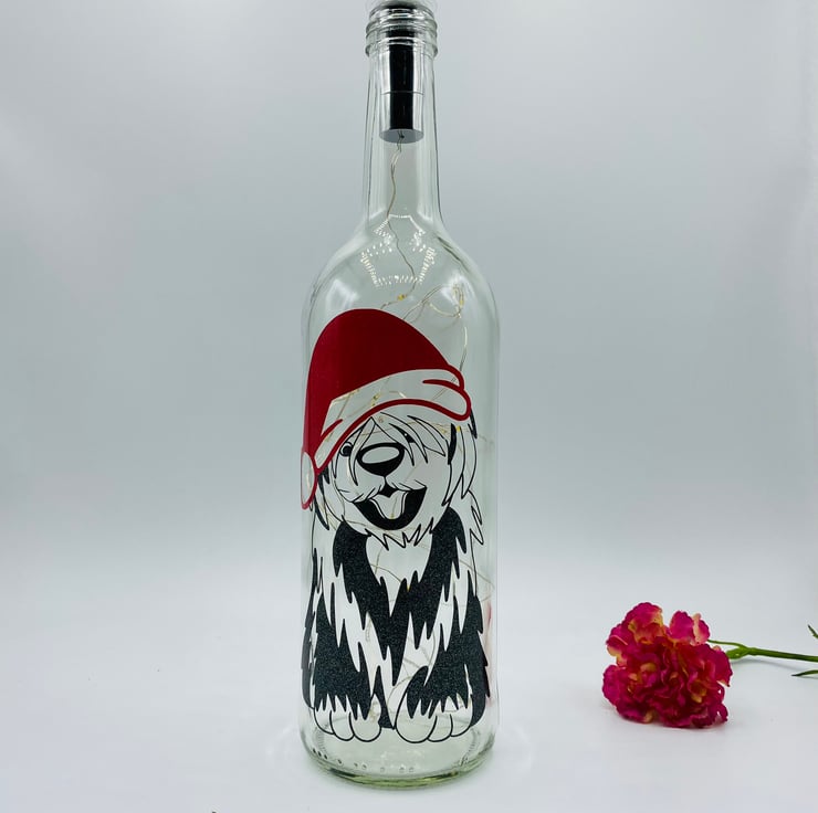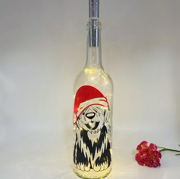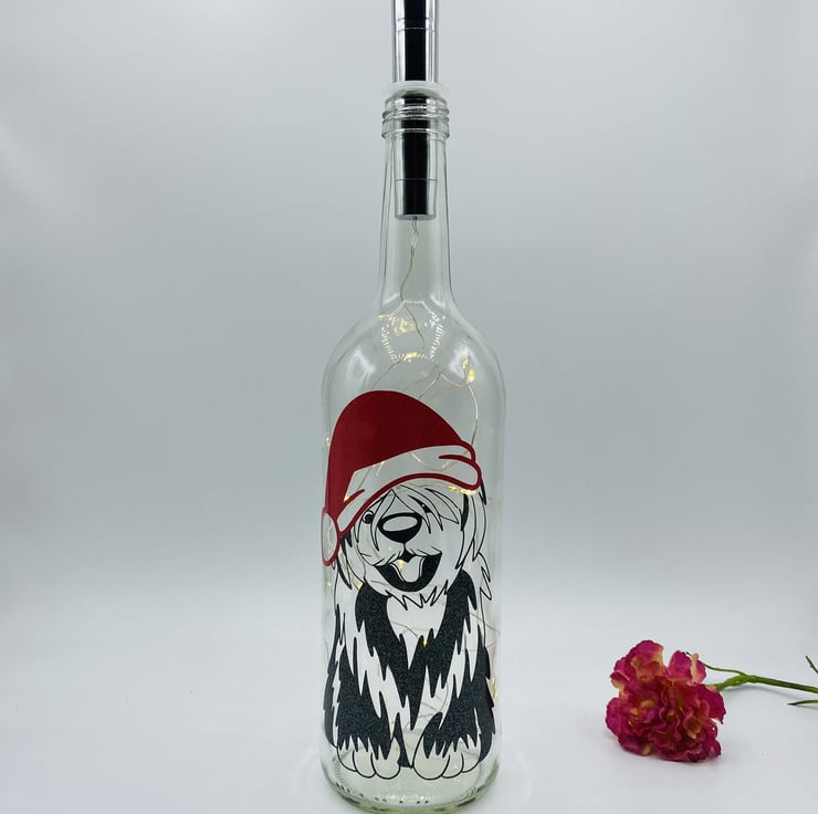 The "Old English Sheepdog Santa Wine Bottle Light" is a festive decor piece which features a clear glass wine bottle illuminated by soft LED lights, casting a warm and cozy glow. It is the perfect OES Christmas gift for any dog lover. The lights are attached to a silver metal cork, which conveniently fits into the top of the bottle and are battery-operated with a single AA battery. They can be easily replaced by unscrewing the top of the cork.