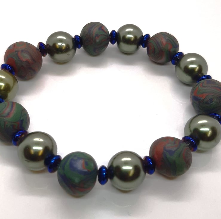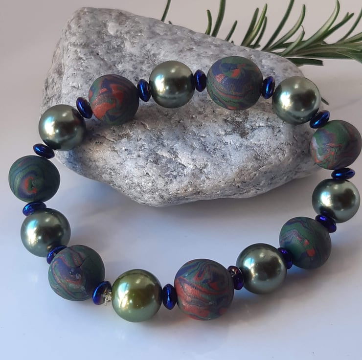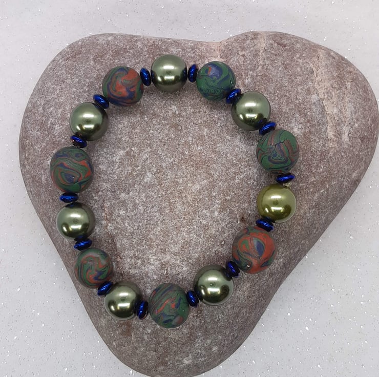 A distinctive bracelet featuring handmade polymer clay beads in a dark green, navy and sienna in a unique swirl design.