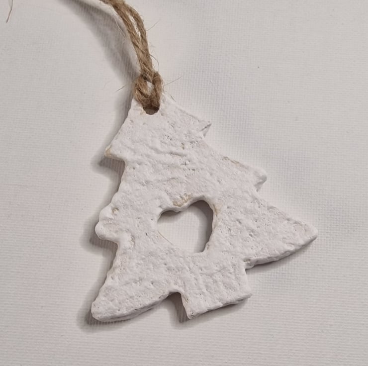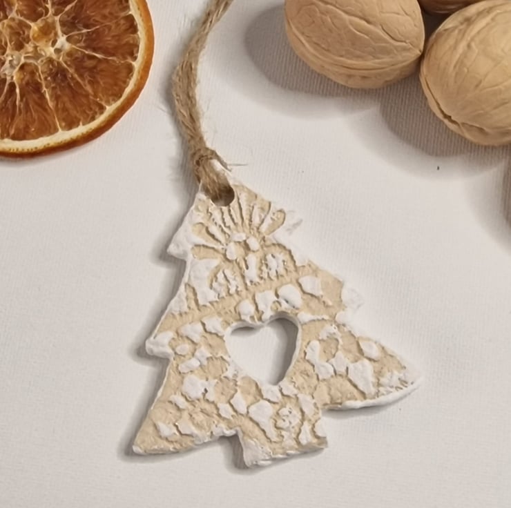 Handmade Ceramic Christmas Tree with a heart cut out. Textured with a lace pattern.