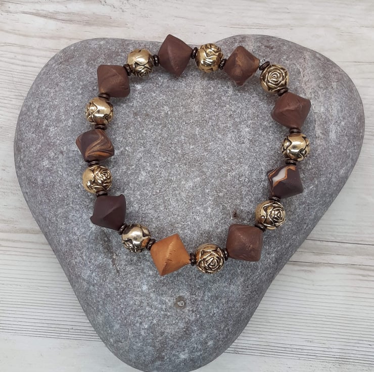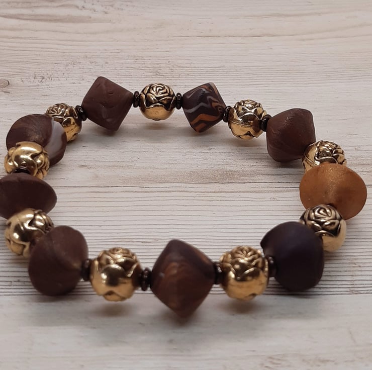 A distinctive bracelet featuring handmade polymer clay beads in shades of brown in a unique swirl design.