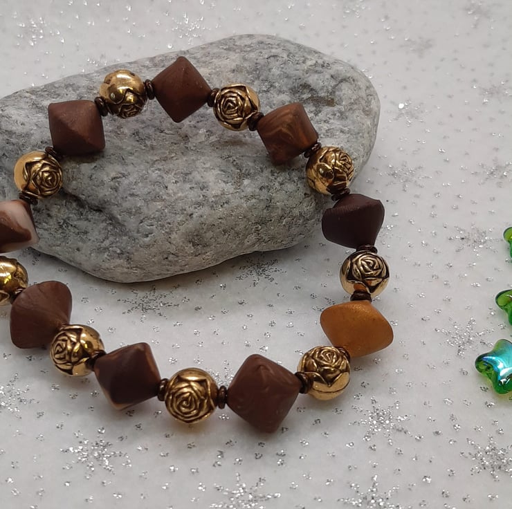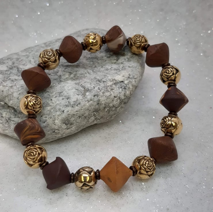 The handmade rhombus shaped beads measure approx. 12mm with 9mm gold plated ‘rose’ rounds and brown seed bead saucer spacers to complete the look