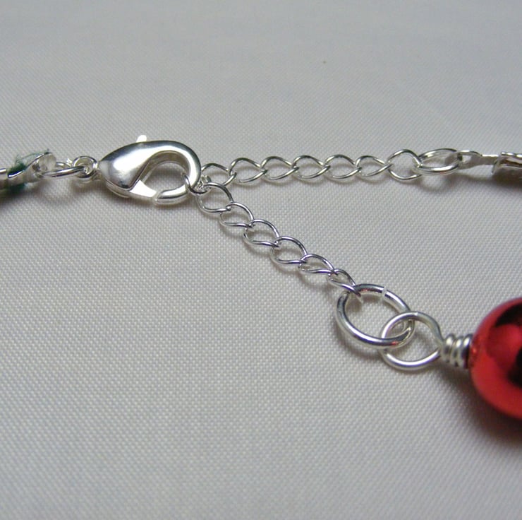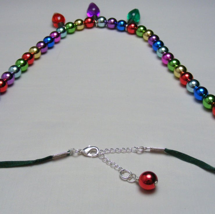 This brightly coloured necklace would look lovely worn with that Christmas party outfit. I have handmade the necklace with, 10mm aluminium assorted colour baubles and threaded them onto green velvet ribbon along with 30x10mm red, purple and green acrylic light bulbs. Bulbs do not work but shimmer in any light source.