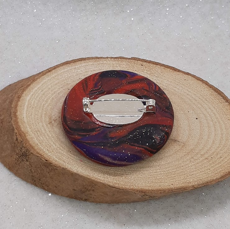Handmade round brooch using a blend of red, purple, black and silver polymer clay to create a unique swirl design with a touch of sparkle.