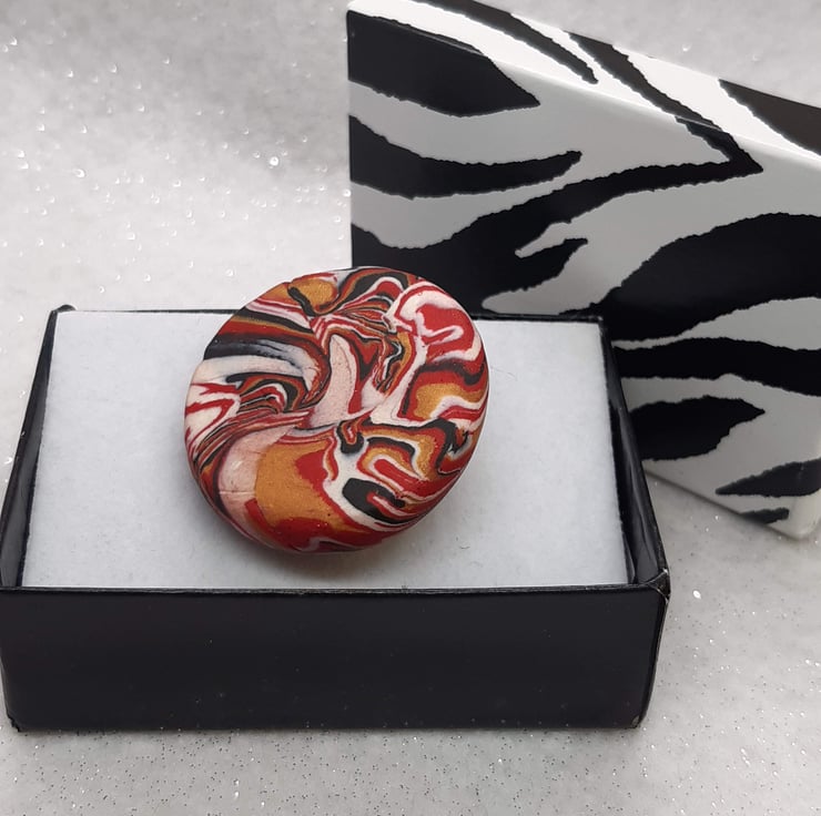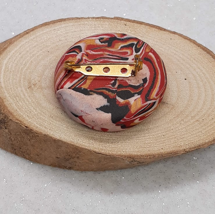 Handmade round brooch using a blend of red, gold. black and white polymer clay to create a unique swirl design with a hint of sparkle