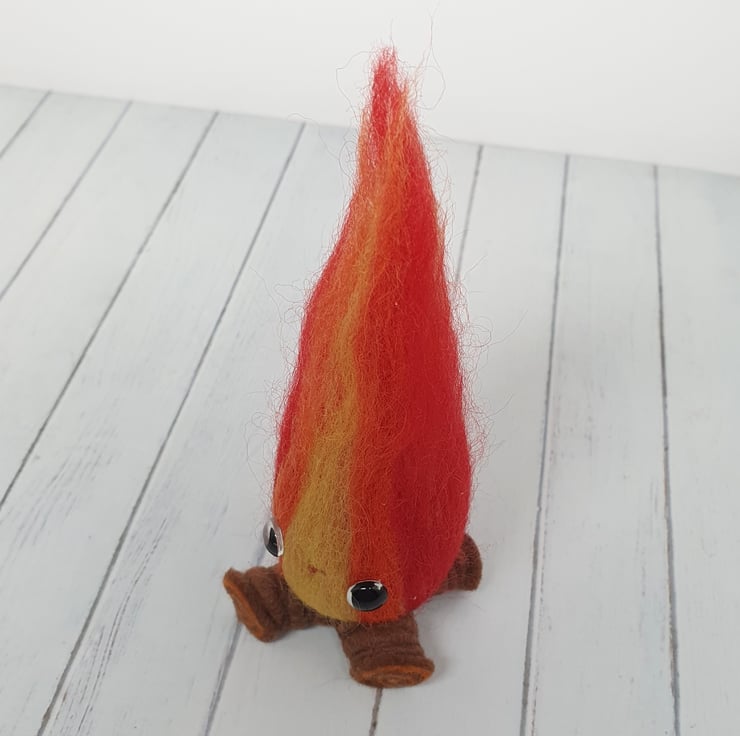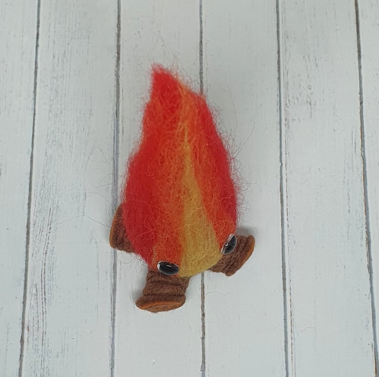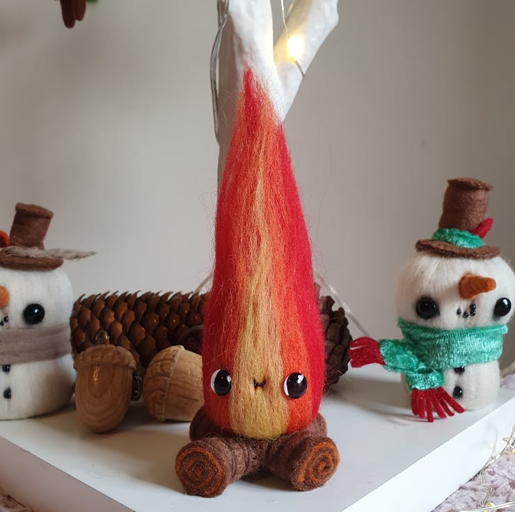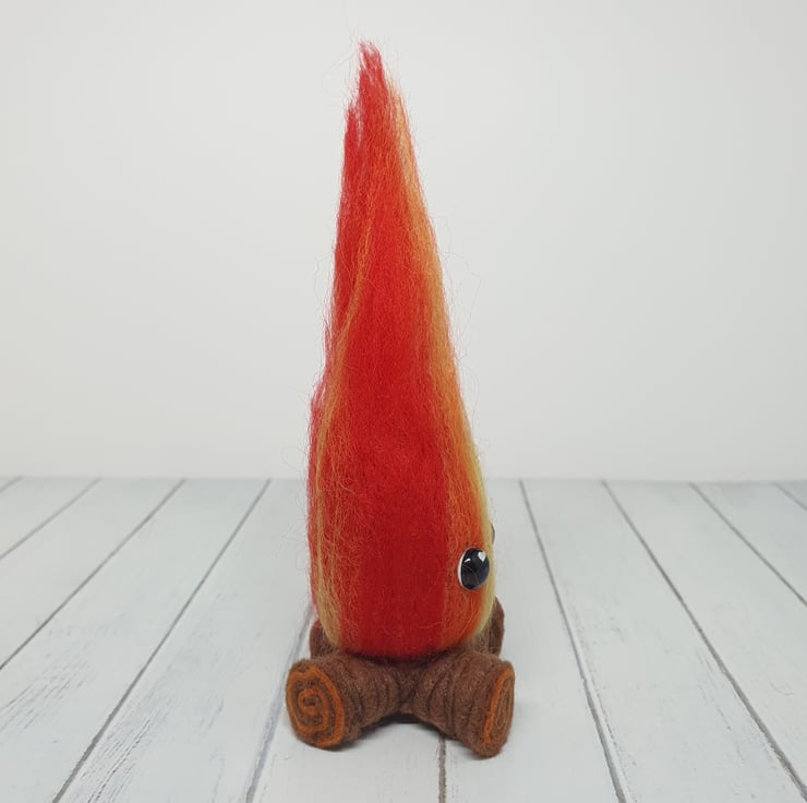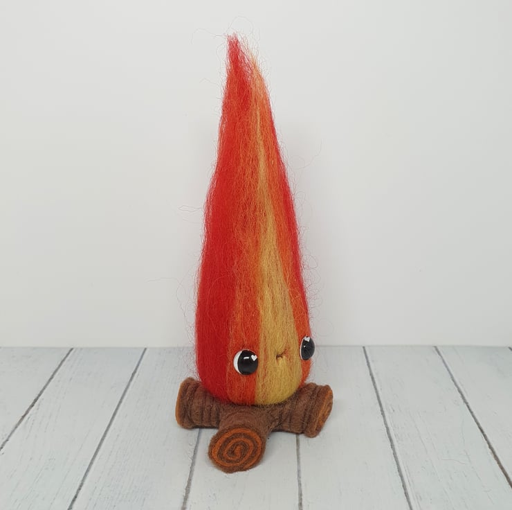 Needlefelted log fire with wool flames and glass eyes. Flames sit on hand stitched felt logs. This log fire sits unaided and measures roughly 13cm tall and 5cm wide. One of a kind piece.