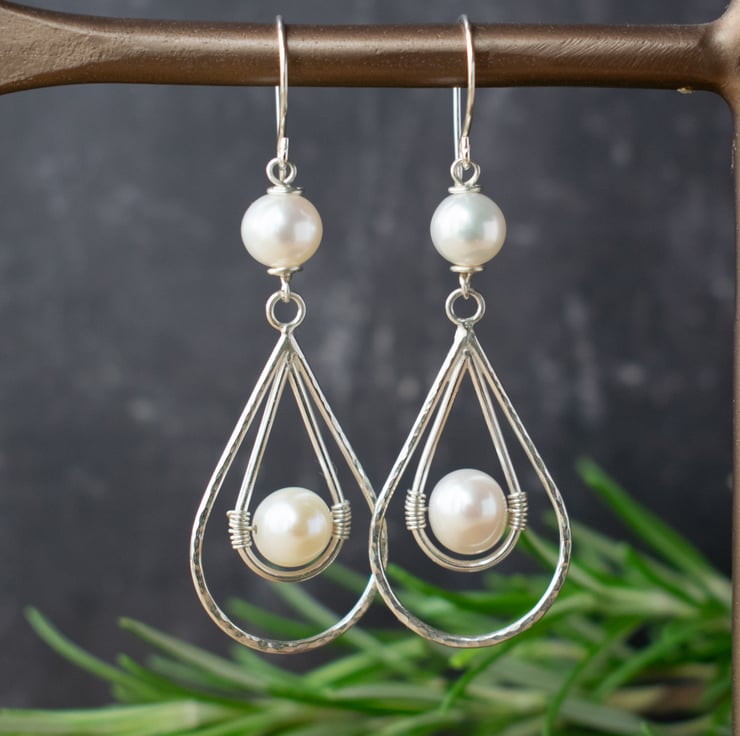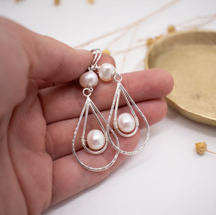 Silver dangle earrings featuring freshwater pearls encased in a sterling silver teardrop shape. An elegant and bold design which makes a striking alternate to the classic pearl earring.